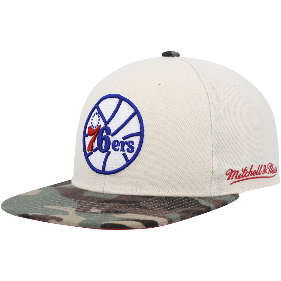 Show your unwavering support for the Philadelphia 76ers by sporting this Hardwood Classics 1976 NBA All-Star Game Off White fitted hat from Mitchell & Ness. It features embroidered graphics and a side patch honoring team history. The sublimated camo pattern and contrast-color undervisor combine to make this unique cap the perfect option to represent the Philadelphia 76ers.