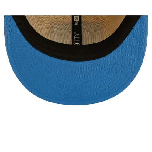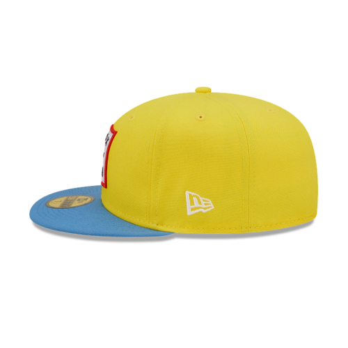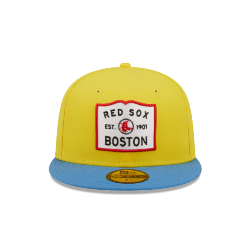 This New Era 59FIFTY Boston Red Sox City Connect fitted hat has a yellow six panel structured high crown and embroidered eyelets with a yellow fabric squatchee button and blue flat bill. The fitted has a blue undervisor and black sweatband.