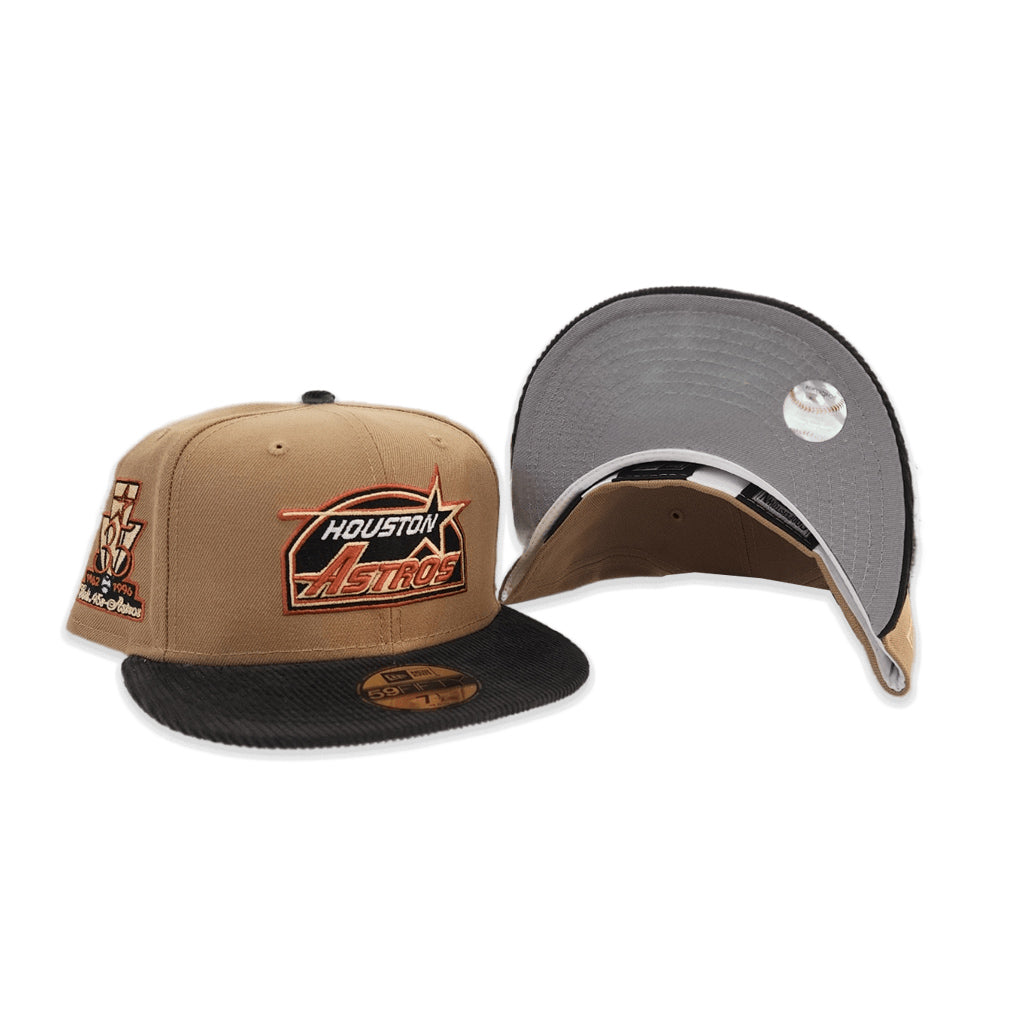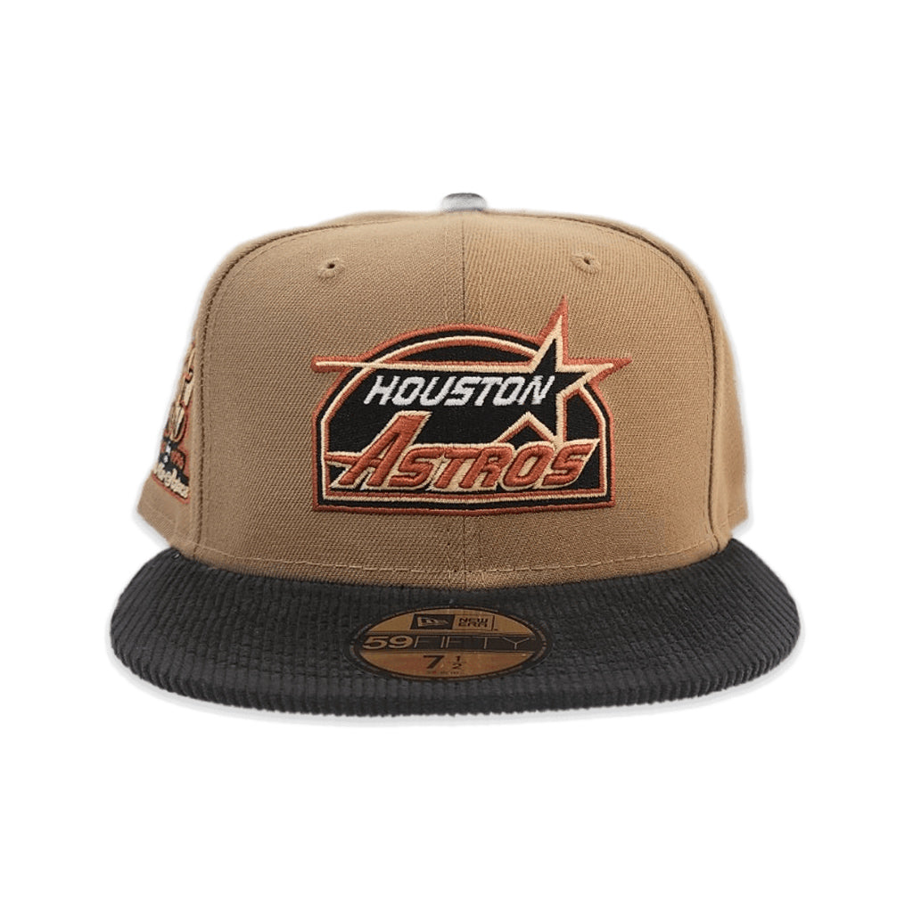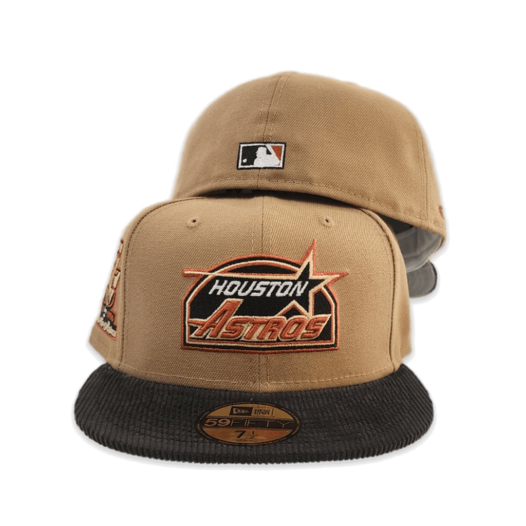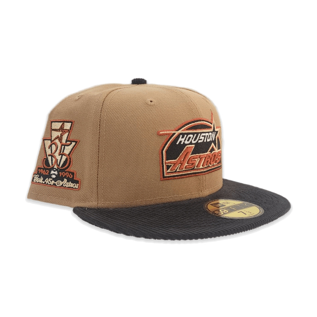This New Era Houston Astros 35 Great Years Khaki/Black Corduroy 59FIFTY Fitted Hat has a khaki six panel structured high crown and embroidered eyelets with a black fabric squatchee button. The fitted cap also has a black corduroy flat bill with a grey undervisor and white sweatband. The front panel features the Houston Astros logo embroidery and a 35 Years side patch embroidery on the right panel. The left panel of the fitted displays the New Era logo and the official MLB Batterman embroidery on the rear crown.