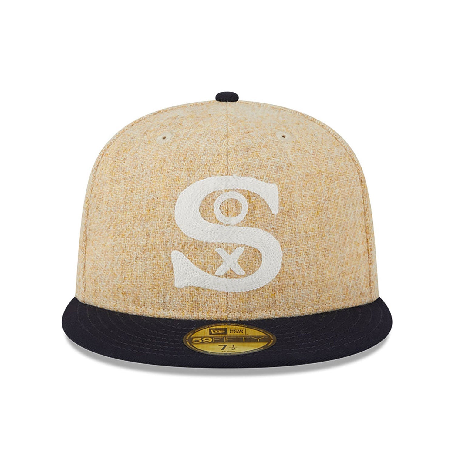This Chicago White Sox fitted hat was released by FAM. The fitted has a tweed six panel structured high crown and embroidered eyelets with a black fabric squatchee button. The flat bill of the cap is black with a grey undervisor and white sweatband. The front panel features the Chicago White Sox logo embroidery and a side patch embroidery on the right panel. The left panel of the fitted displays the New Era logo and the official MLB Batterman logo embroidery on the rear crown.