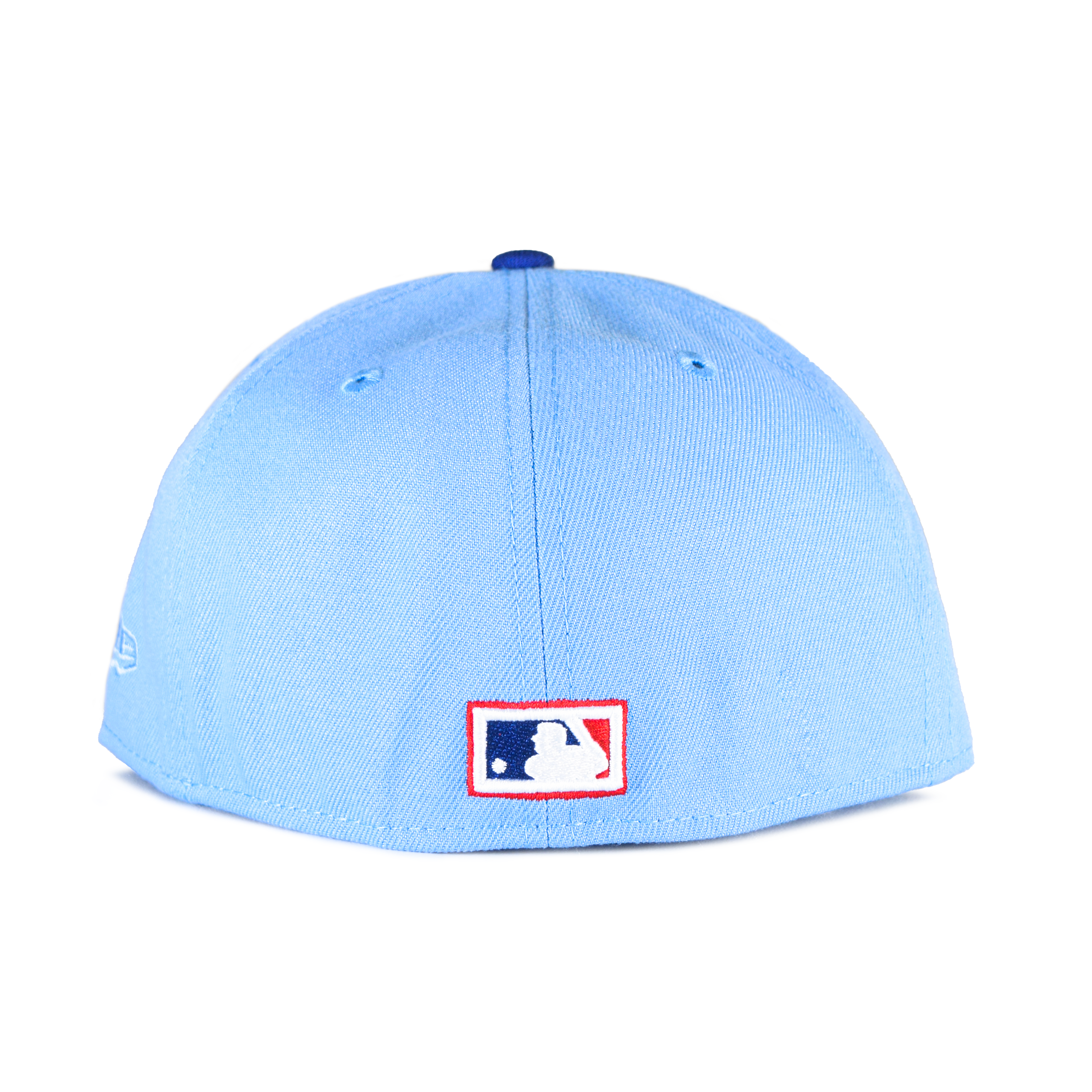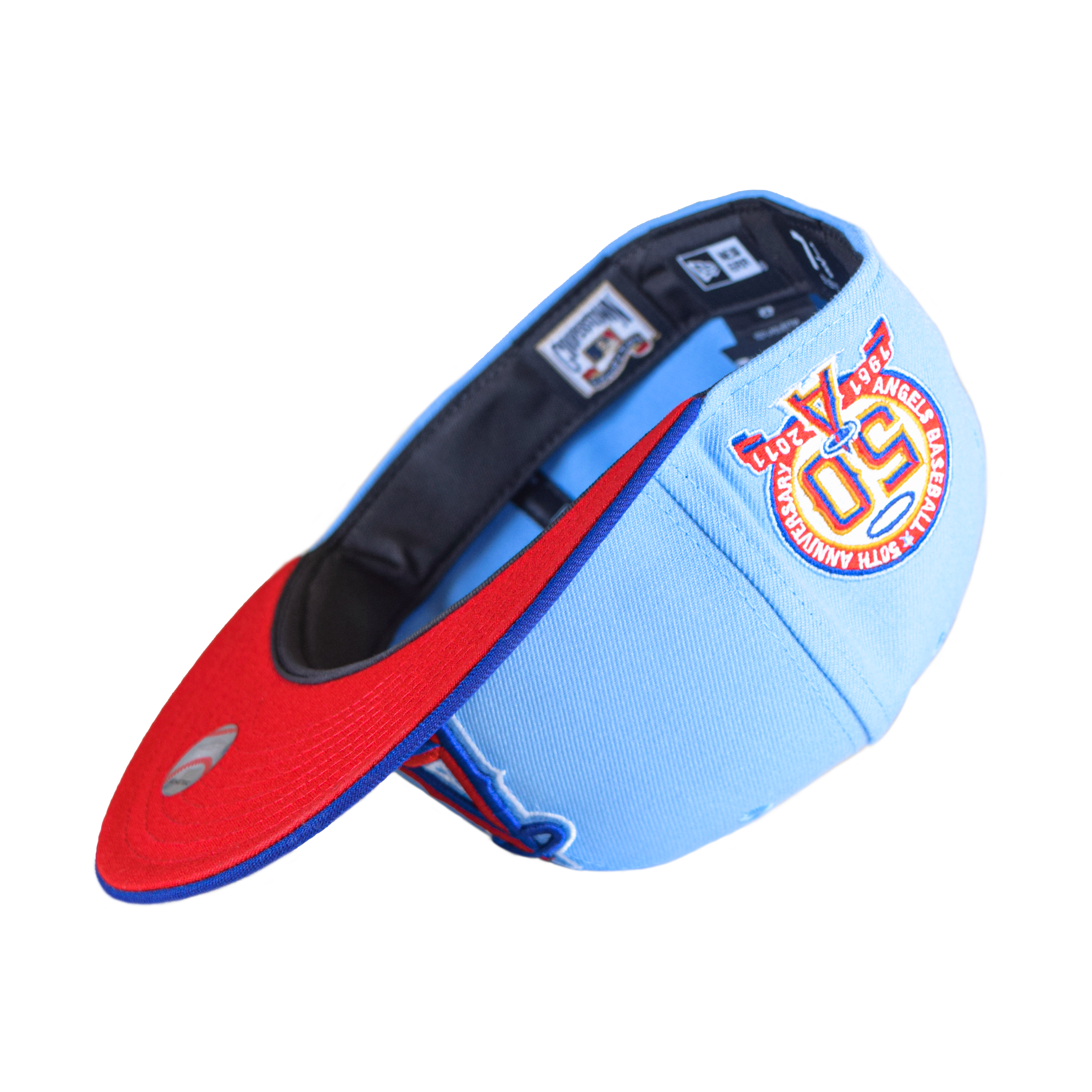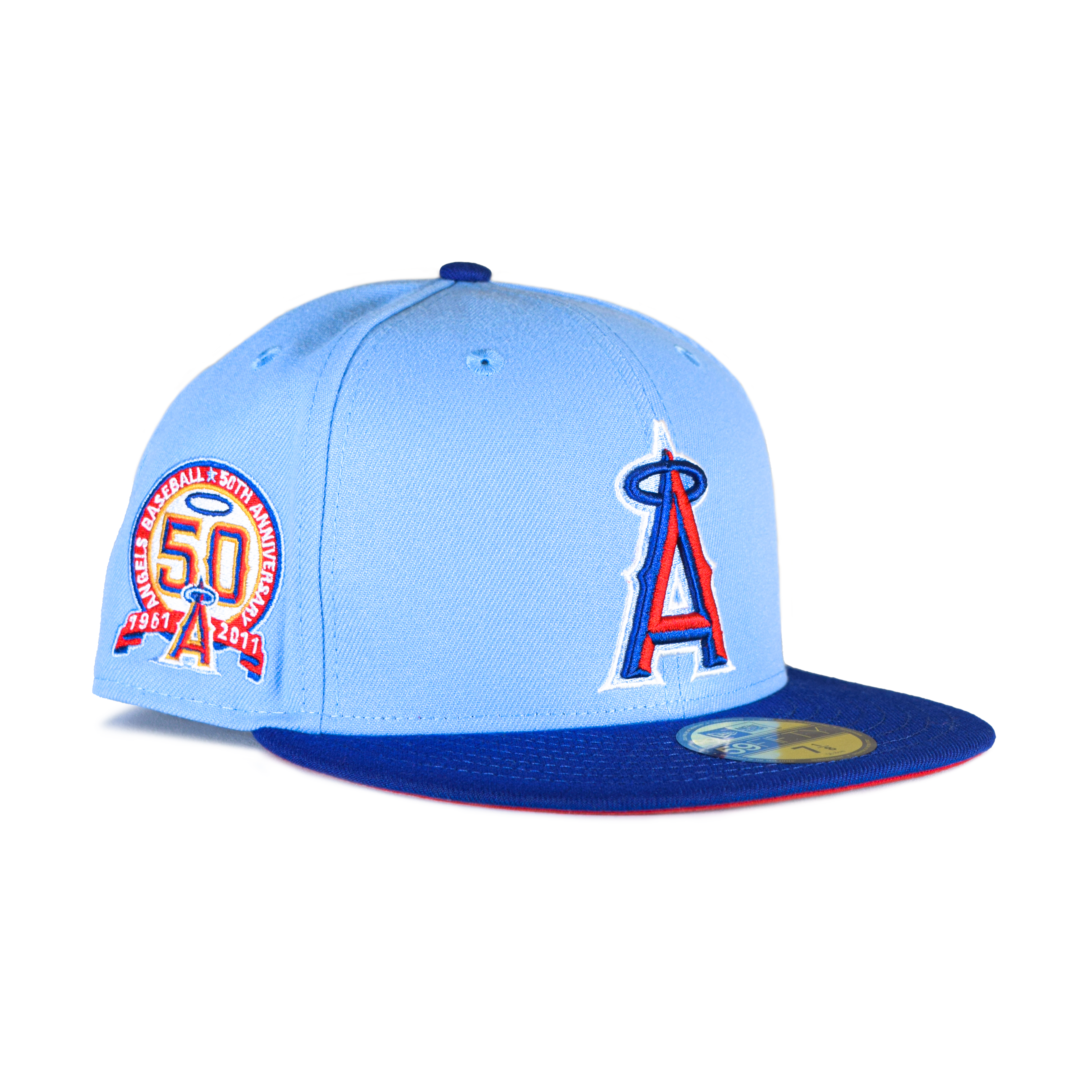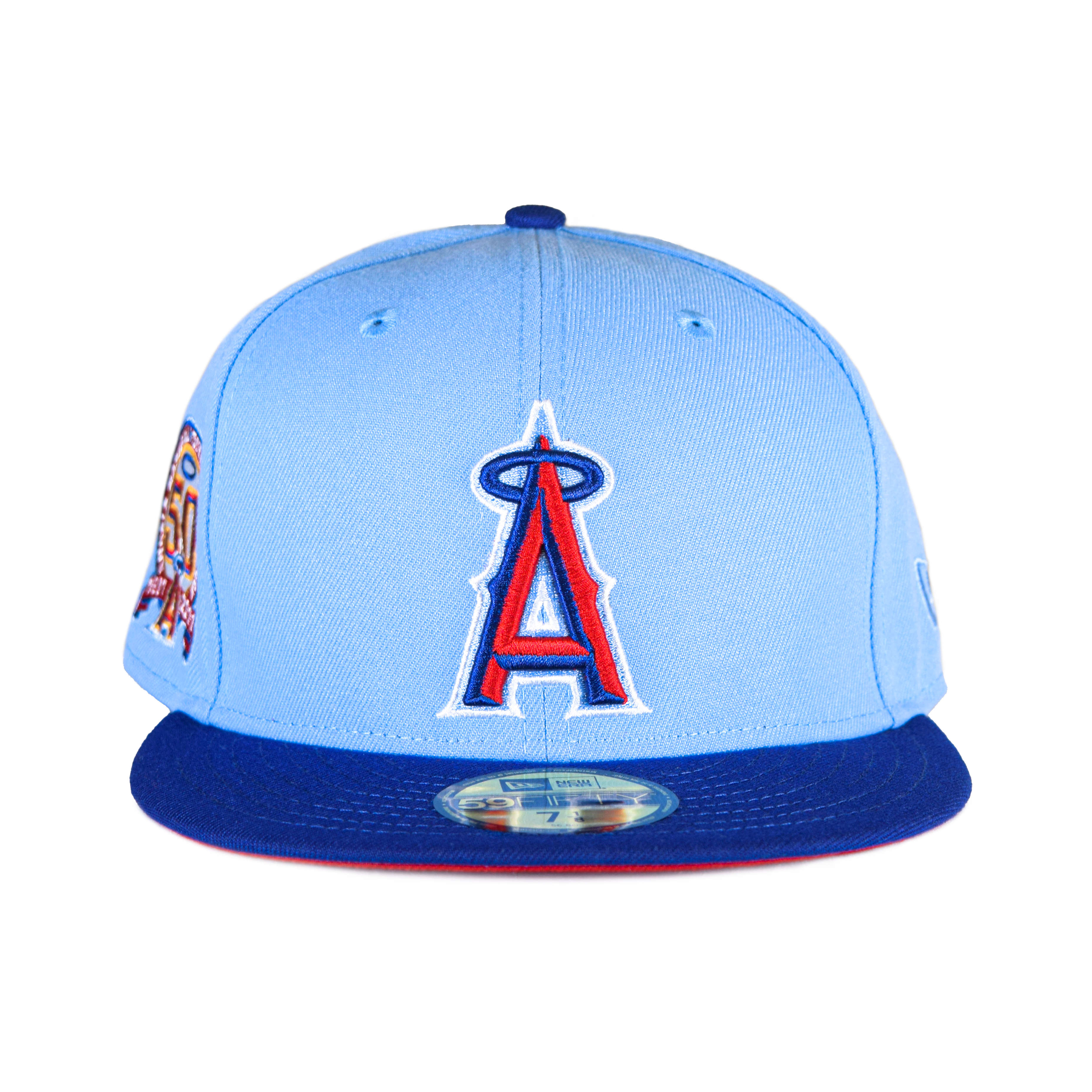 This New Era Anaheim Angels 'Frostbite' 59FIFTY Fitted Hat was released by Capanova. The fitted has a light blue six panel structured high crown and embroidered eyelets with a royal blue fabric squatchee button. The flat bill of the fitted cap is also royal blue with a red bottom undervisor. The front panel features the Anaheim Angels logo embroidery and a side patch embroidered on the right panel. The left panel of the fitted displays the New Era logo and the official Anaheim Angels script embroidered on the rear crown.