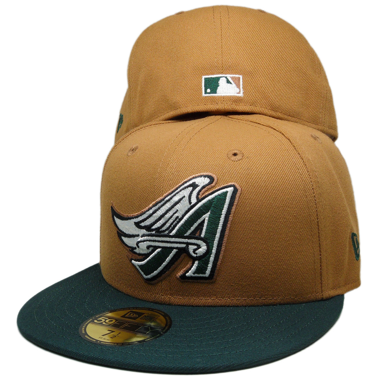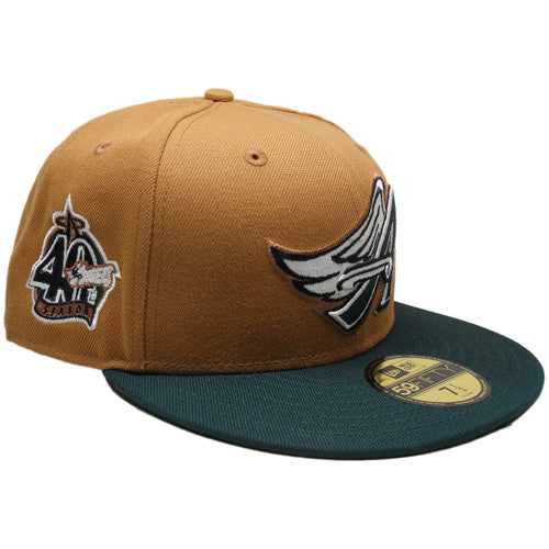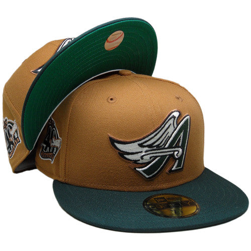 This New Era Anaheim Angels Wheat/Dark Green 50th Anniversary 59FIFTY Fitted Hat was released by Ecapsunlimited. The fitted has a wheat six panel structured high crown and embroidered eyelets with a wheat fabric squatchee button. The fitted cap also has a pine green flat bill with a kelly green undervisor and white sweatband. The front panel features the Anaheim Angels logo embroidery and a 50th Anniversary side patch embroidery on the right panel. The left panel of the fitted displays the New Era logo and the official MLB logo embroidery on the rear crown.