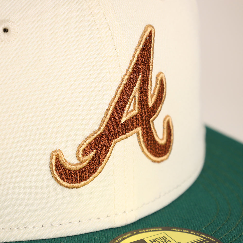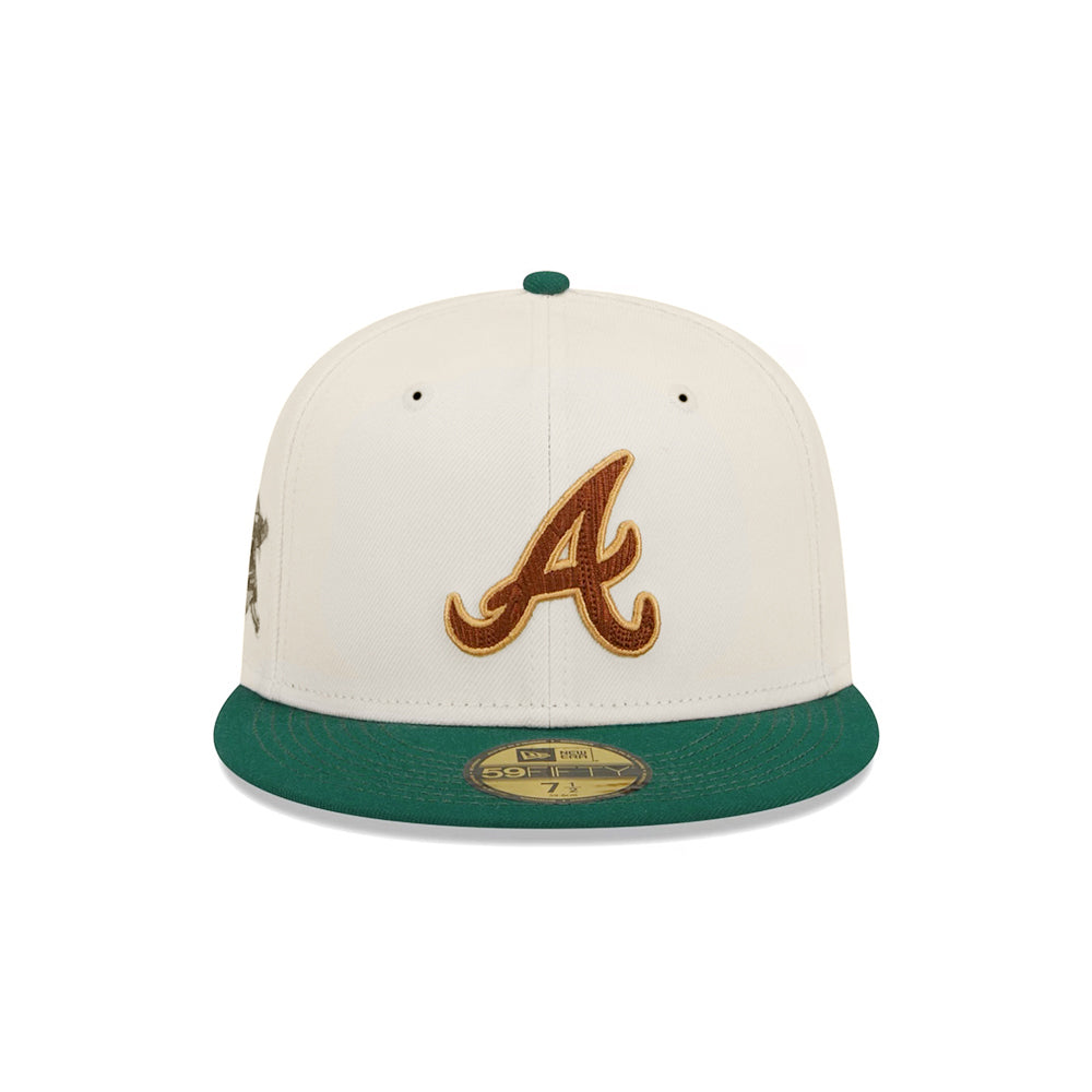 This Atlanta Braves 59FIFTY fitted hat was released by Crown Minded. The fitted has a chrome six panel structured high crown and embroidered eyelets with a green flat bill & fabric squatchee button. The fitted also has a grey bottom under bill with a black sweatband. The front panel features the Atlanta Braves logo embroidery with a matching chrome/green and brown side patch on the right panel. The left panel of the fitted displays the New Era logo and the official MLB Batterman embroidery on the rear crown.