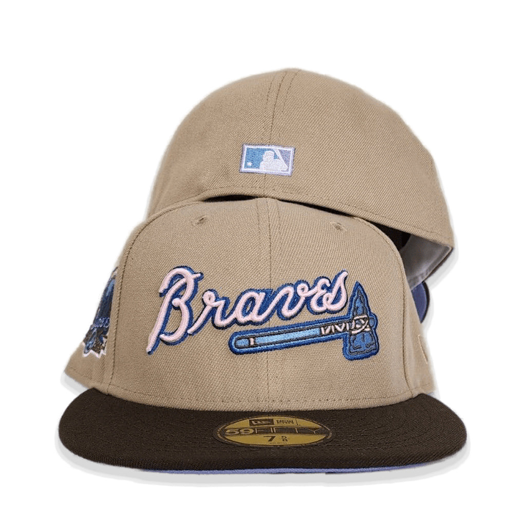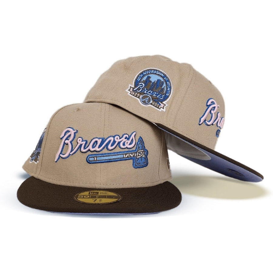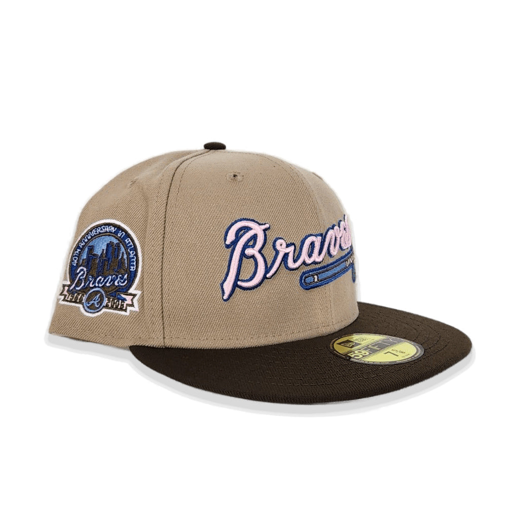 This New Era Atlanta Braves Tan/Brown 40th Anniversary 59FIFTY Fitted Hat was released by EXclusive Fitted. The fitted cap features a tan six panel structured high crown and embroidered eyelets with a dark brown fabric squatchee button and flat bill. The fitted has a lavender undervisor and a white sweatband. The front panel includes the Atlanta Braves logo embroidery and the New Era logo embroidered on the left panel with a celebratory side patch on the right panel. The official MLB insignia is embroidered on the rear crown.