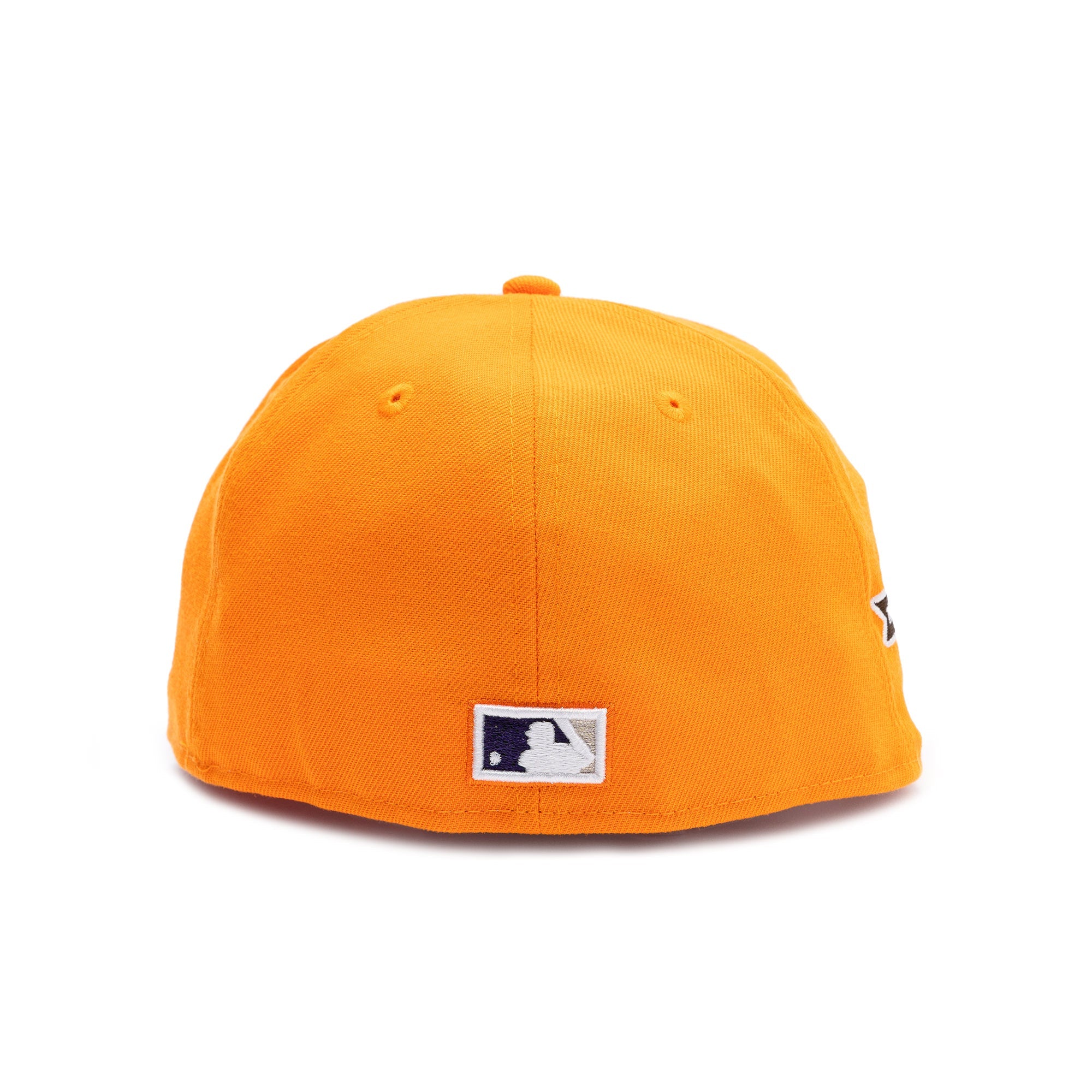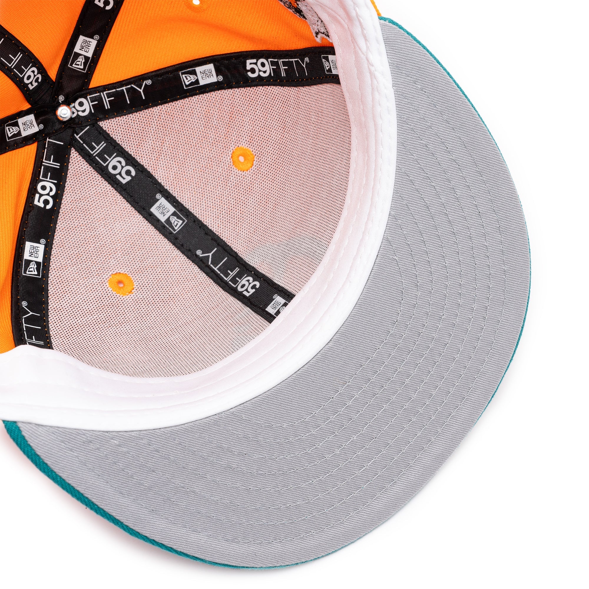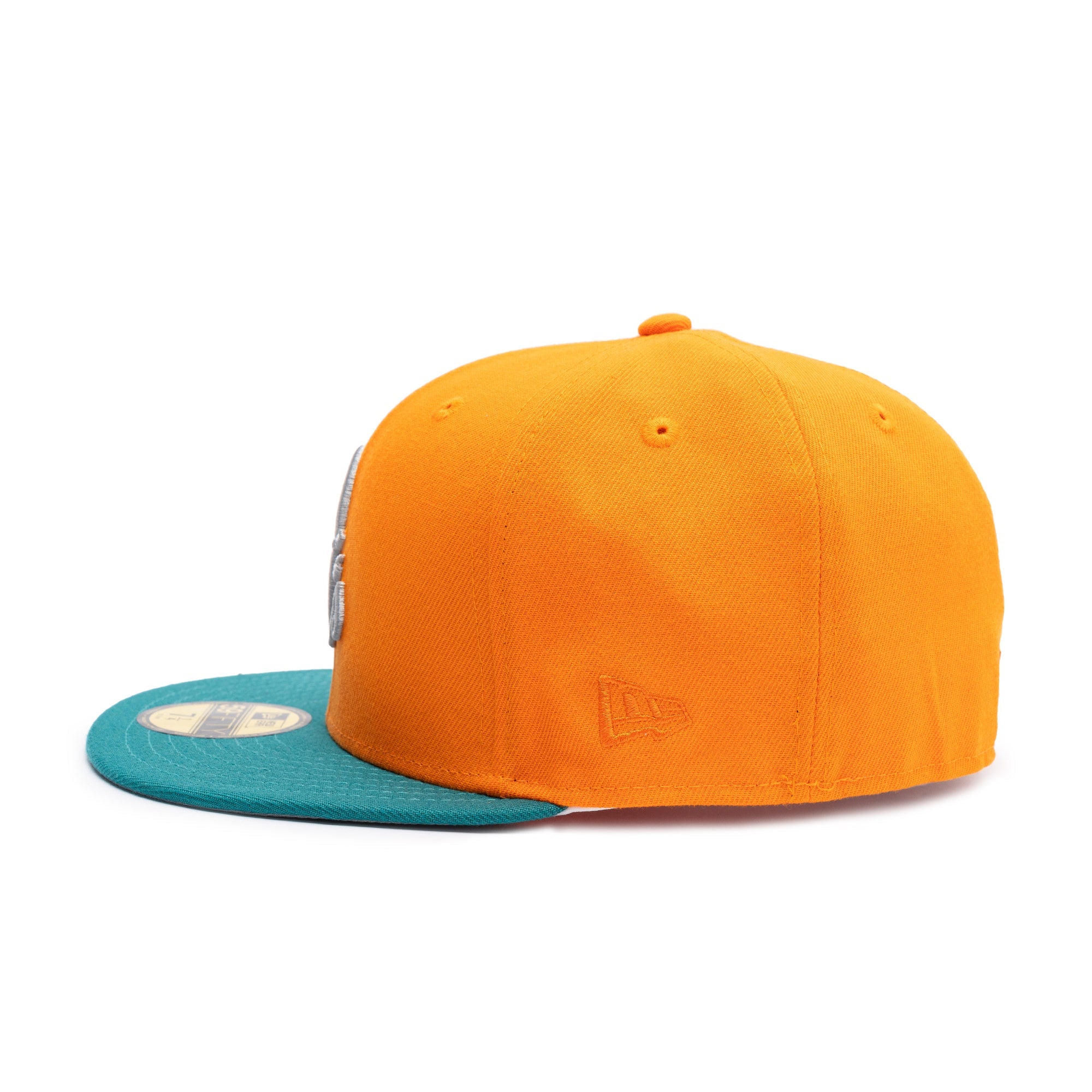 This New Era Baltimore Orioles 50th Anniversary 'Doctor Octopus' 59FIFTY Fitted Hat has a orange six panel structured high crown and embroidered eyelets with a orange fabric squatchee button. The fitted cap has a teal flat bill with a grey undervisor. The front panel features the Baltimore Orioles logo embroidery and a 50th Anniversary side patch embroidery on the right panel. The left panel of the fitted displays the New Era logo and the official MLB logo embroidery on the rear crown.