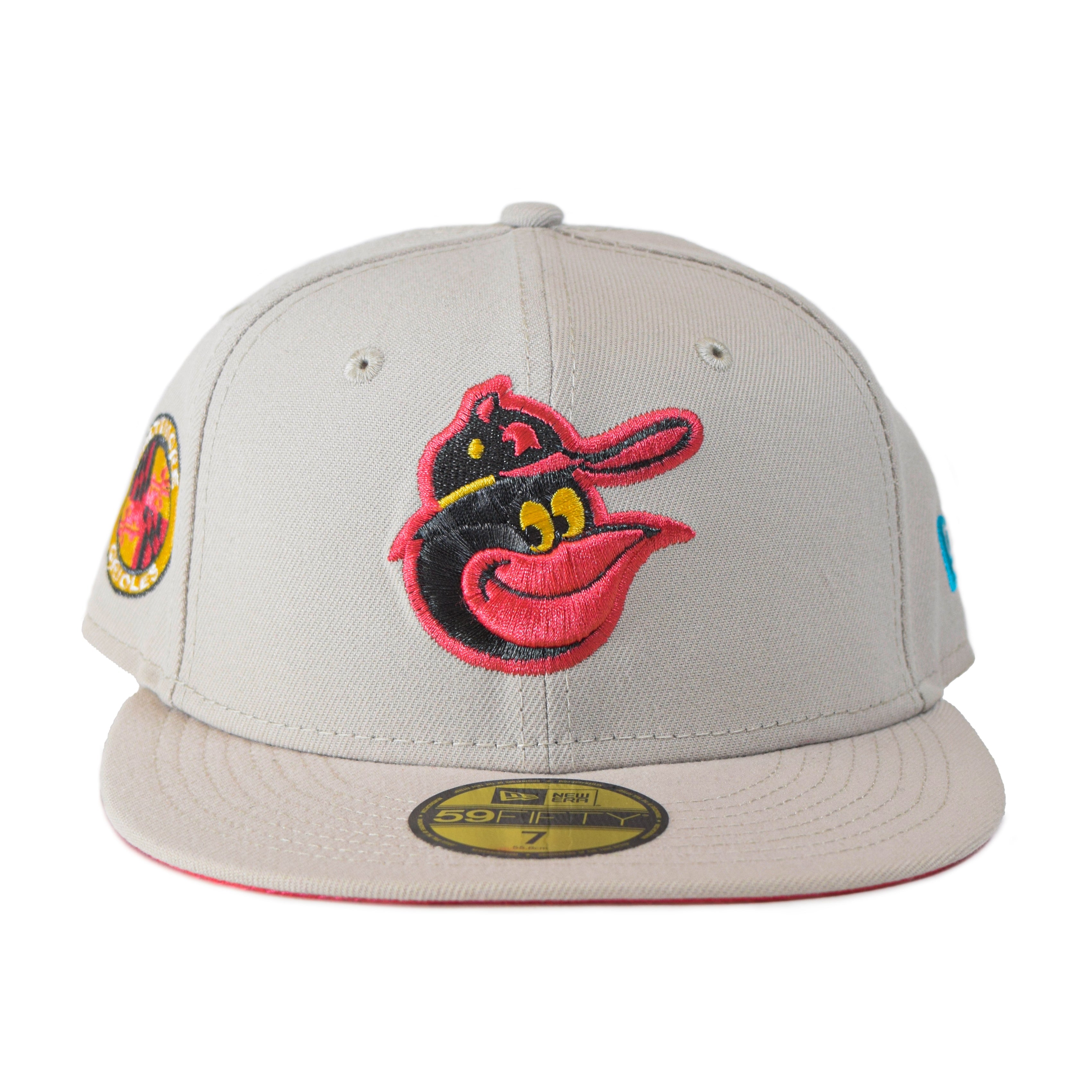 This New Era Baltimore Orioles Stone Fluorescent Pink UV 59FIFTY Fitted Hat has a stone six panel structured high crown, embroidered eyelets with and fabric squatchee button. The fitted cap also has a stone flat bill with a fluorescent pink undervisor and black sweatband. The front panel features the Baltimore Orioles logo embroidery and a side patch embroidered on the right panel. The left panel of the fitted displays the New Era logo and the official MLB logo embroidery on the rear crown.