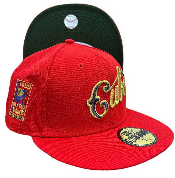 This New Era Chicago Cubs "Five Mic Pack" Red 1933 All-Star Game 59FIFTY Fitted Hat was dropped by Pro Image Sports. The fitted has a red six panel structured high crown and embroidered eyelets with a red fabric squatchee button. The fitted cap also has a red flat bill with a dark green undervisor. The front panel features the Chicago Cubs logo embroidery and a side patch embroidery on the right panel. The left panel of the fitted displays the New Era logo and the official MLB logo embroidery on the rear crown.