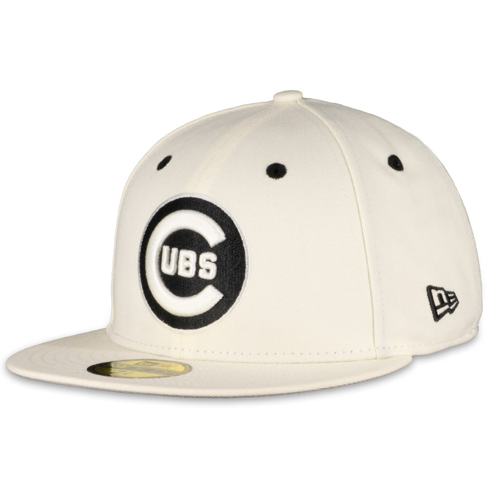 This Chicago Cubs fitted hat was released by Just Sports. The fitted has a ivory six panel structured high crown and embroidered eyelets with an ivory fabric squatchee button. The flat bill of the cap is also ivory with an undervisor and sweatband. The front panel features the Chicago Cubs logo embroidery and a side patch embroidery on the right panel. The left panel of the fitted displays the New Era logo and the official MLB logo embroidery on the rear crown.