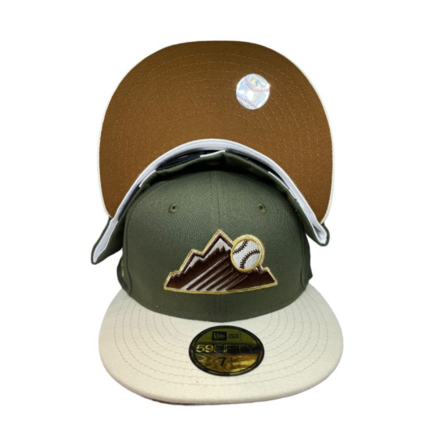 This New Era Colorado Rockies "Olive Gus Recess" 25th Anniversary 59FIFTY Fitted Hat was dropped by Pro Image Sports. The fitted has a olive green six panel structured high crown and embroidered eyelets with a stone fabric squatchee button. The fitted cap also has a stone flat bill with a brown undervisor. The front panel features the Colorado Rockies logo embroidery and a side patch embroidery on the right panel. The left panel of the fitted displays the New Era logo and the official MLB logo embroidery on the rear crown.