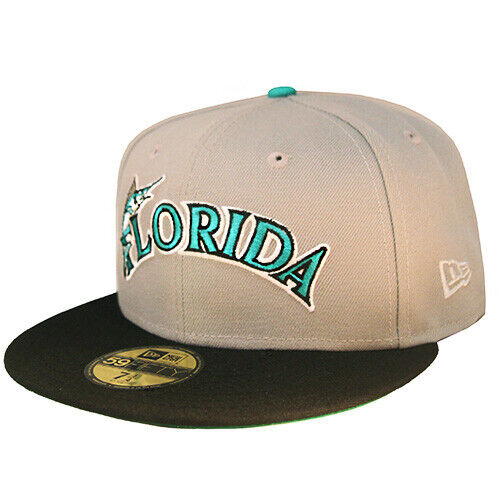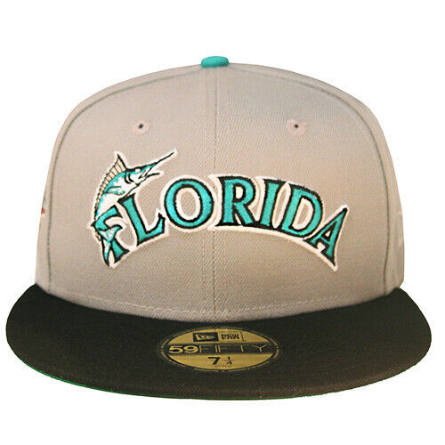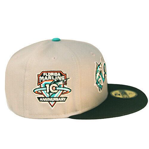 This New Era Florida Marlins 59FIFTY fitted hat has a grey six panel structured high crown and embroidered eyelets with a teal fabric squatchee button. The flat bill of the fitted is also black. The front panel features the Florida Marlins logo embroidered in teal and black stitching, a 10th Anniversary side patch on the right panel and the official MLB Batterman logo on the rear-crown.