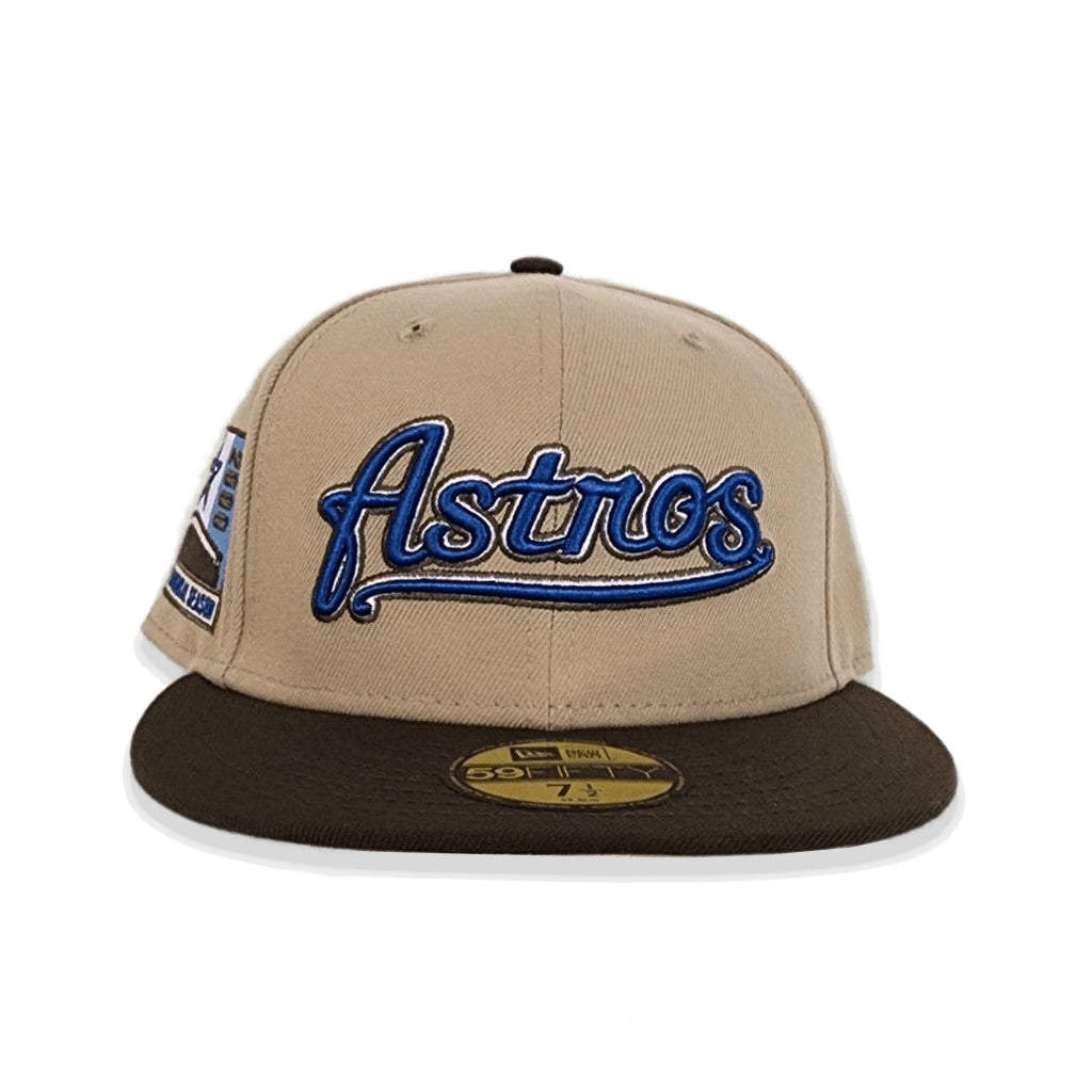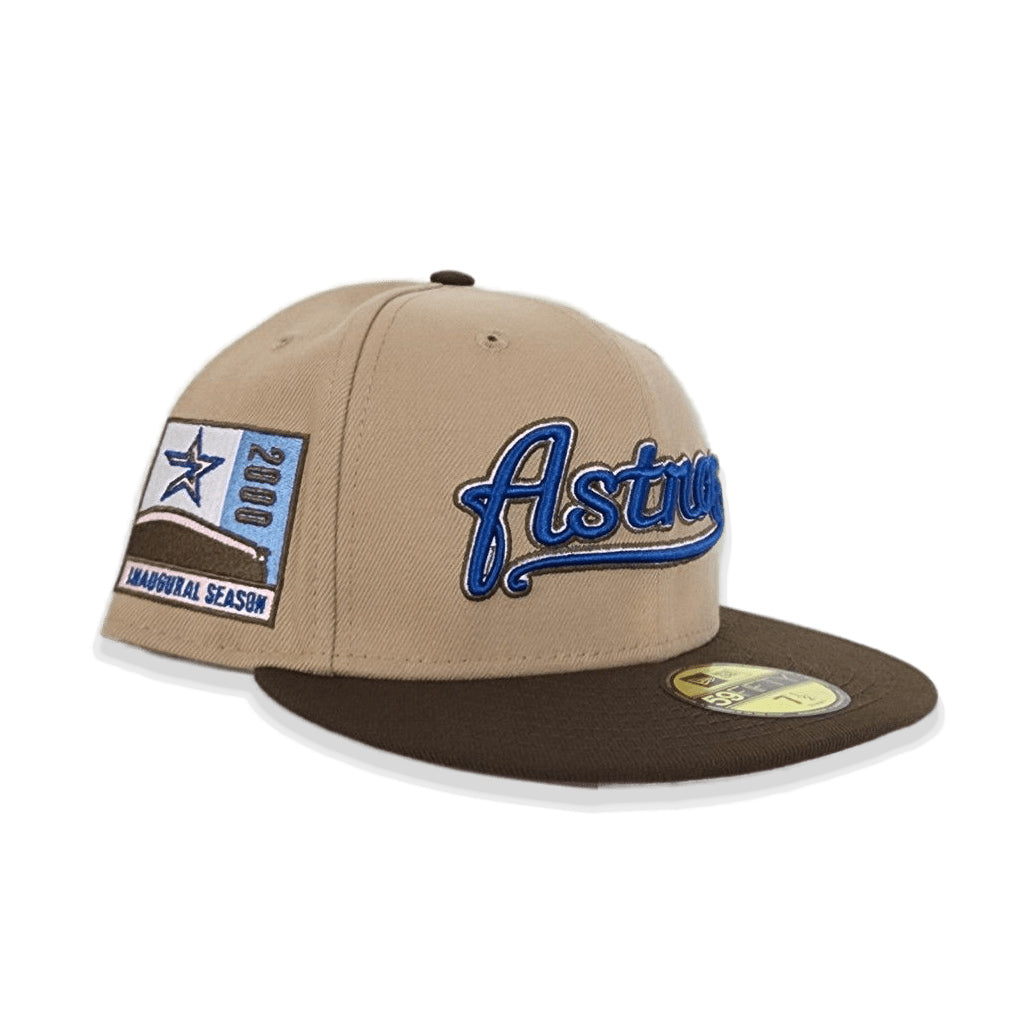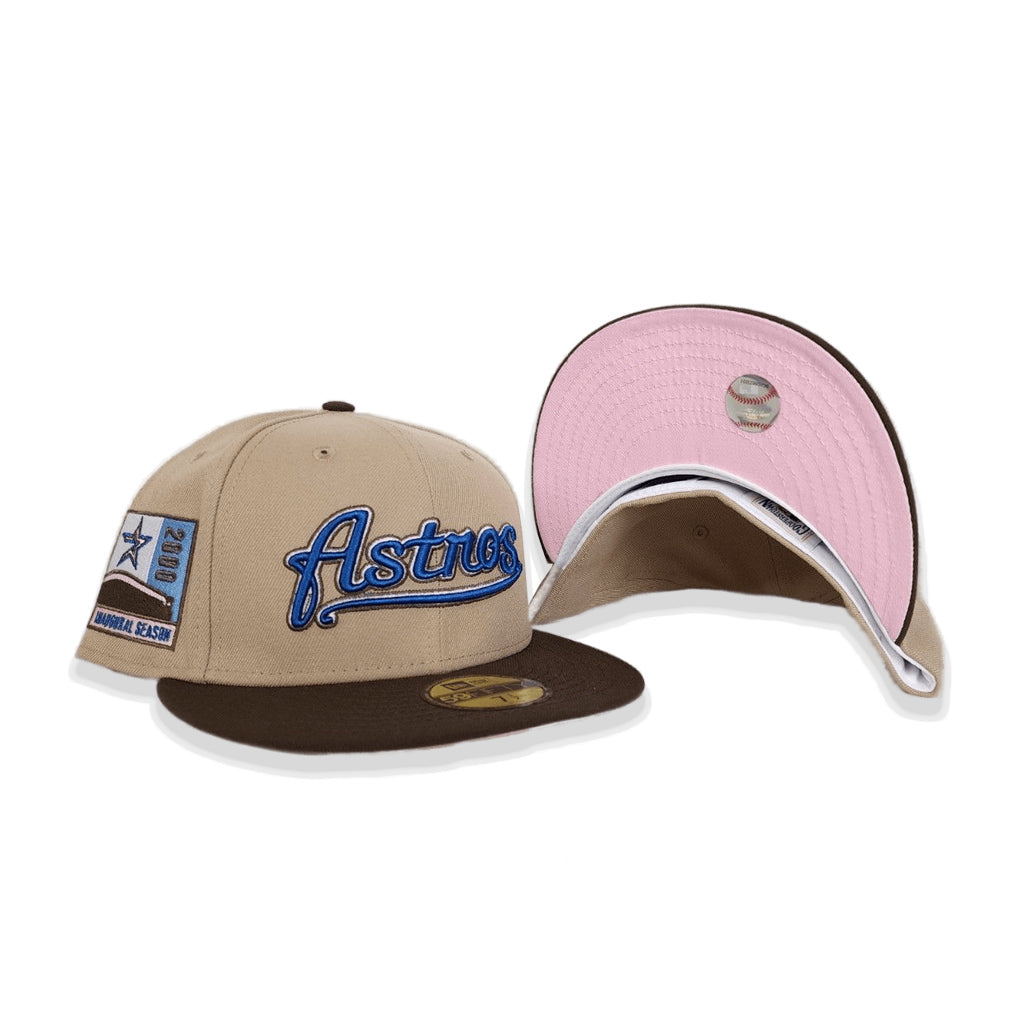 This New Era Houston Astros Tan/Brown 2000 Inaugural Season 59FIFTY Fitted Hat was released by EXclusive Fitted. The fitted cap features a tan six panel structured high crown and embroidered eyelets with a dark brown fabric squatchee button and flat bill. The fitted has a pink undervisor and a white sweatband. The front panel includes the Houston Astros logo embroidery and the New Era logo embroidered on the left panel with a celebratory side patch on the right panel. The official MLB insignia is embroidered on the rear crown.