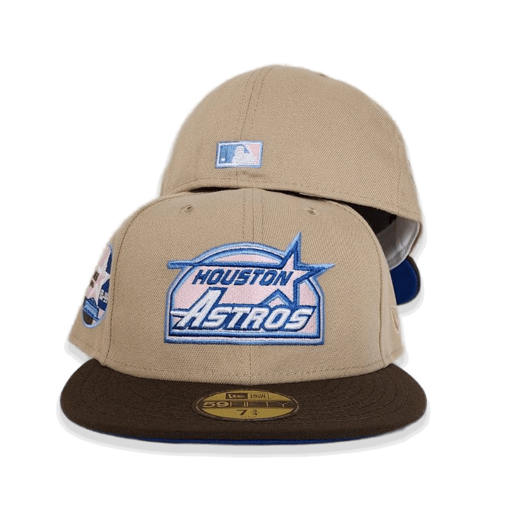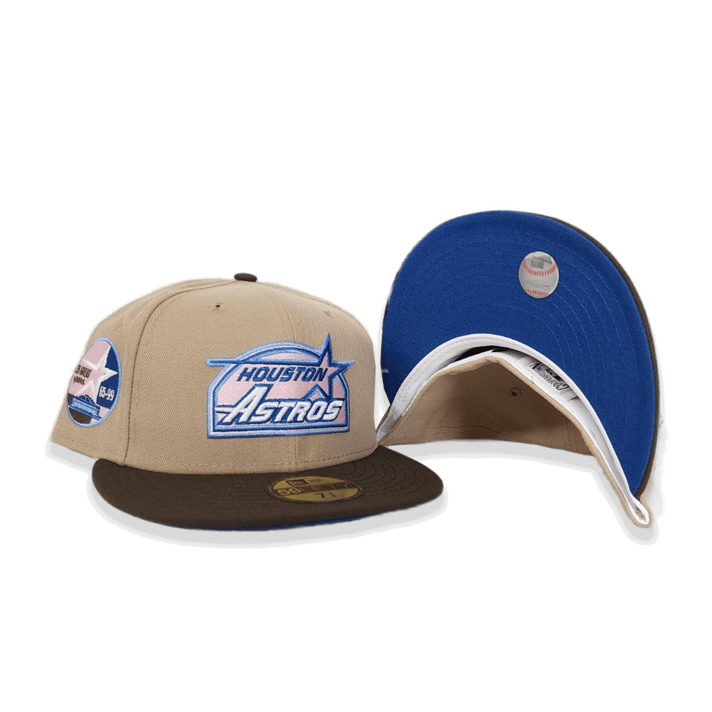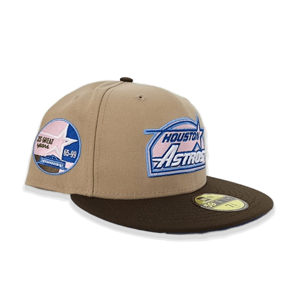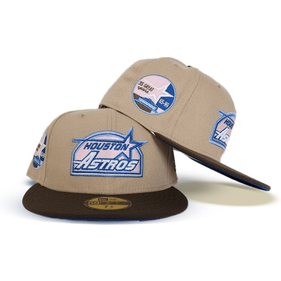 This New Era Houston Astros Tan/Brown 35th Great Years 59FIFTY Fitted Hat was released by EXclusive Fitted. The fitted cap features a tan six panel structured high crown and embroidered eyelets with a dark brown fabric squatchee button and flat bill. The fitted has a sea blue undervisor and a white sweatband. The front panel includes the Houston Astros logo embroidery and the New Era logo embroidered on the left panel with a celebratory side patch on the right panel. The official MLB insignia is embroidered on the rear crown.