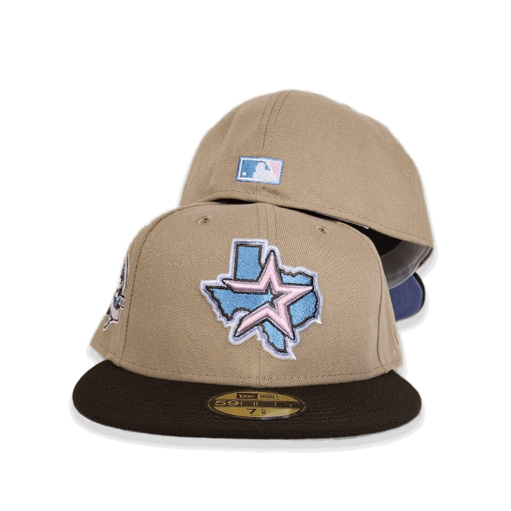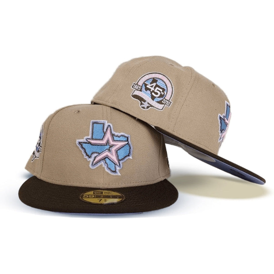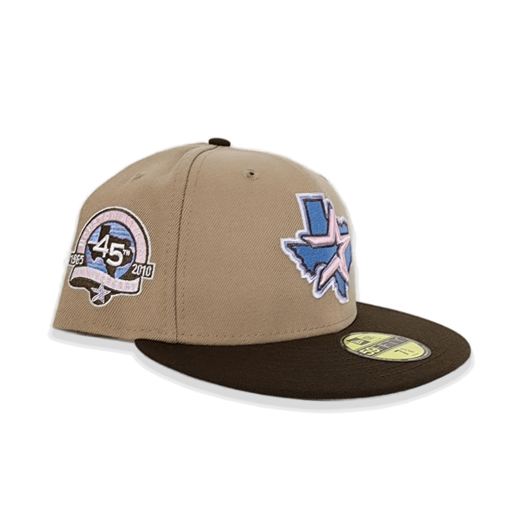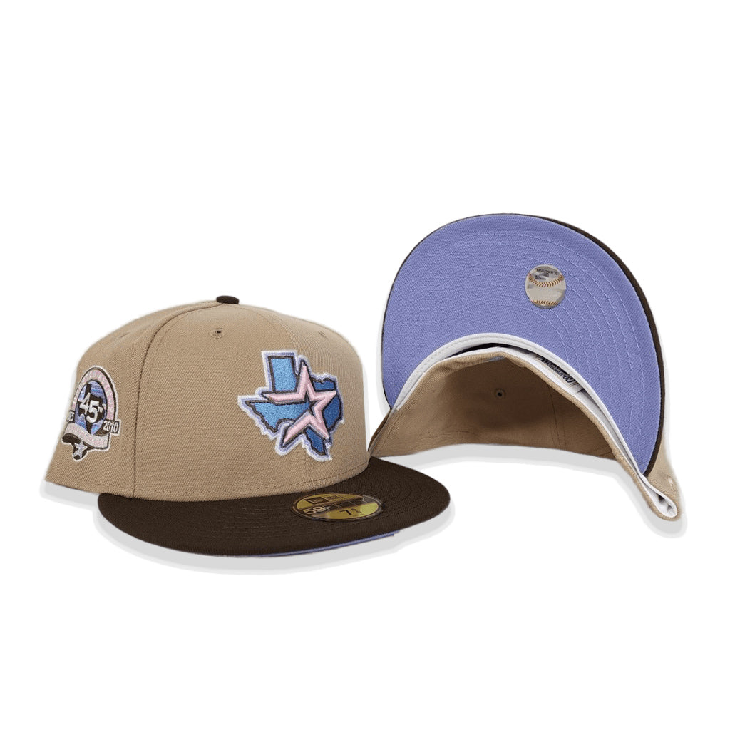 This New Era Houston Astros Tan/Brown 45th Anniversary 59FIFTY Fitted Hat was released by EXclusive Fitted. The fitted cap features a tan six panel structured high crown and embroidered eyelets with a dark brown fabric squatchee button and flat bill. The fitted has a lavender undervisor and a white sweatband. The front panel includes the Houston Astros logo embroidery and the New Era logo embroidered on the left panel with a celebratory side patch on the right panel. The official MLB insignia is embroidered on the rear crown.