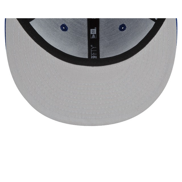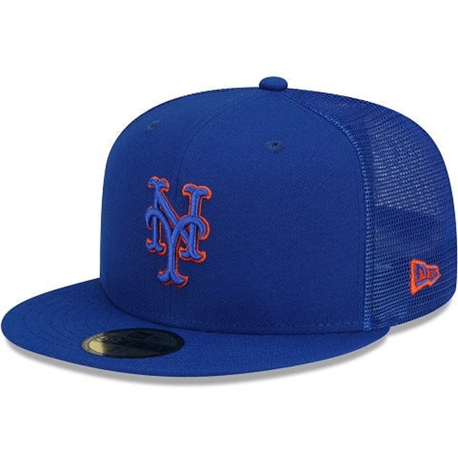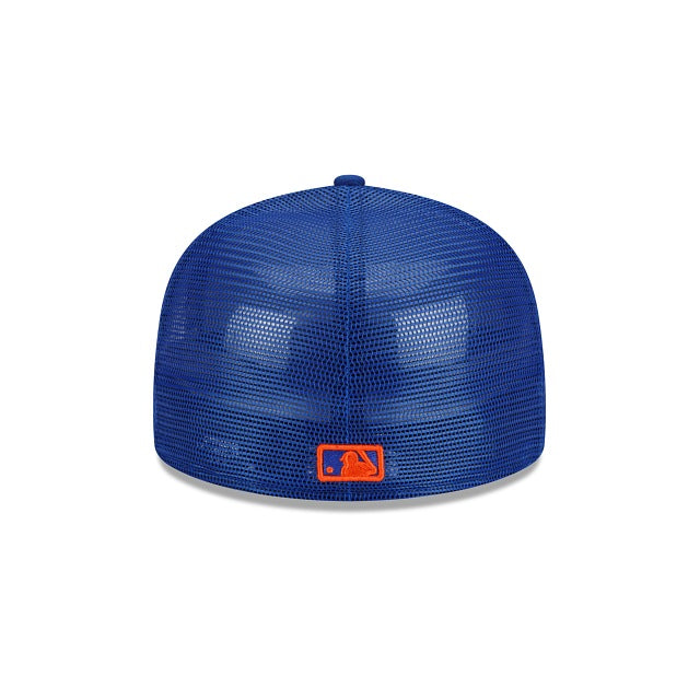 The New York Mets 2023 Batting Practice 59FIFTY Fitted Cap features an embroidered Mets logo at the front panels with a matching MLB Batterman logo at the rear and a gray undervisor.