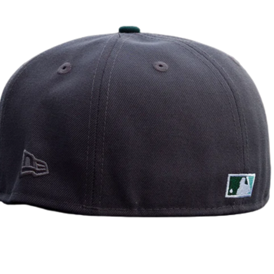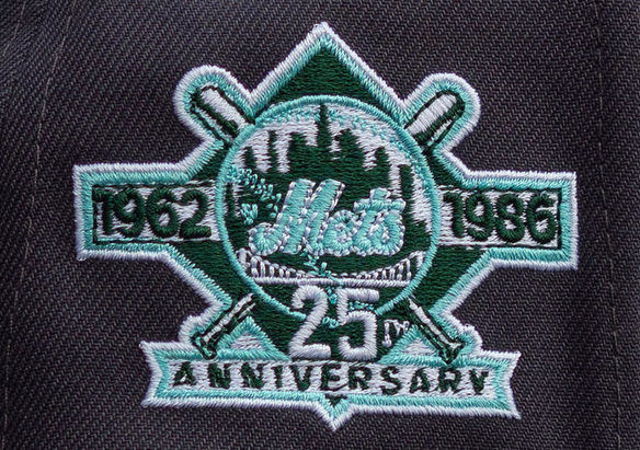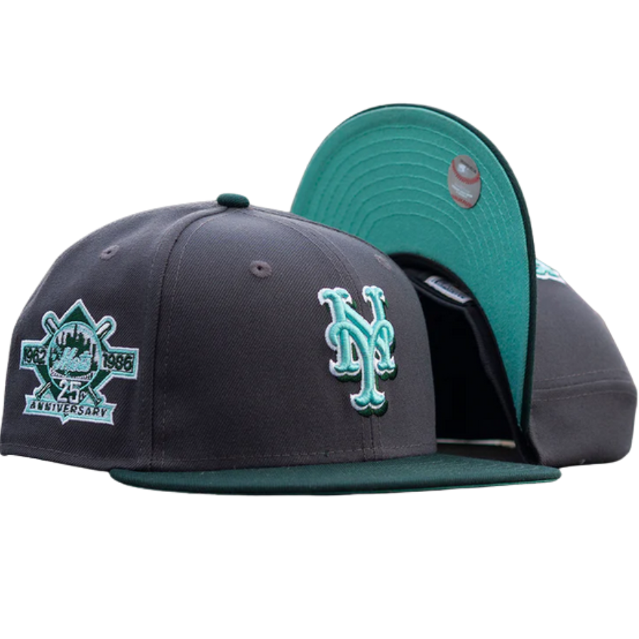 This New Era New York Mets 25th Anniversary Clear Mint Undervisor 59FIFTY Fitted Cap has a graphite six panel structured high crown and embroidered eyelets with a dark green fabric squatchee button and flat bill. The undervisor of the fitted is clear mint with a black sweatband. The right panel features 25th Anniversary embroidered patch.