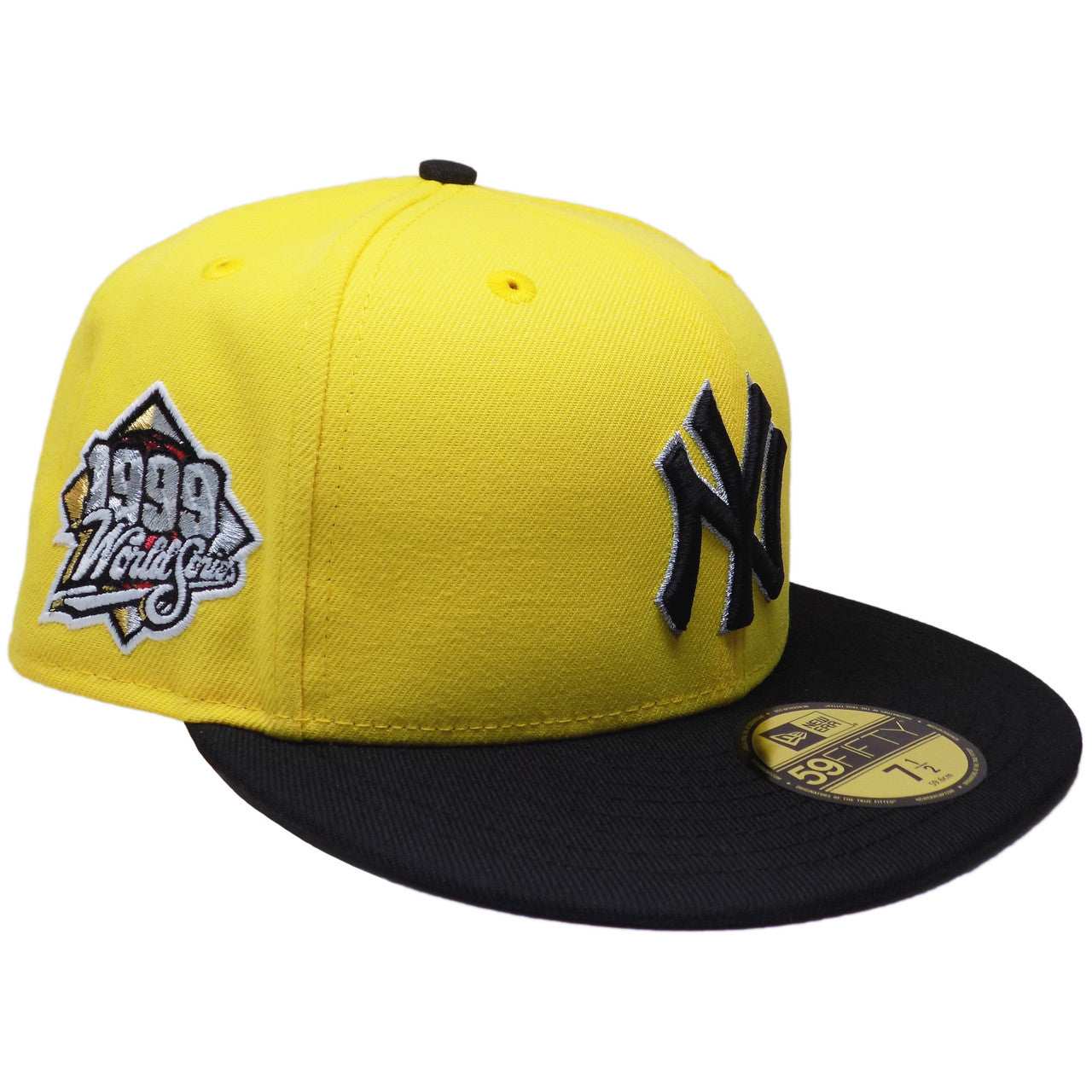 This New York Yankees fitted hat was released by Ecapsunlimited. The fitted has a yellow six panel structured high crown and embroidered eyelets with a black fabric squatchee button. The fitted cap also has a black flat bill. with a gray undervisor. The front panel features the New York Yankees logo embroidered in black threads with a 1999 World Series side patch on the right panel.