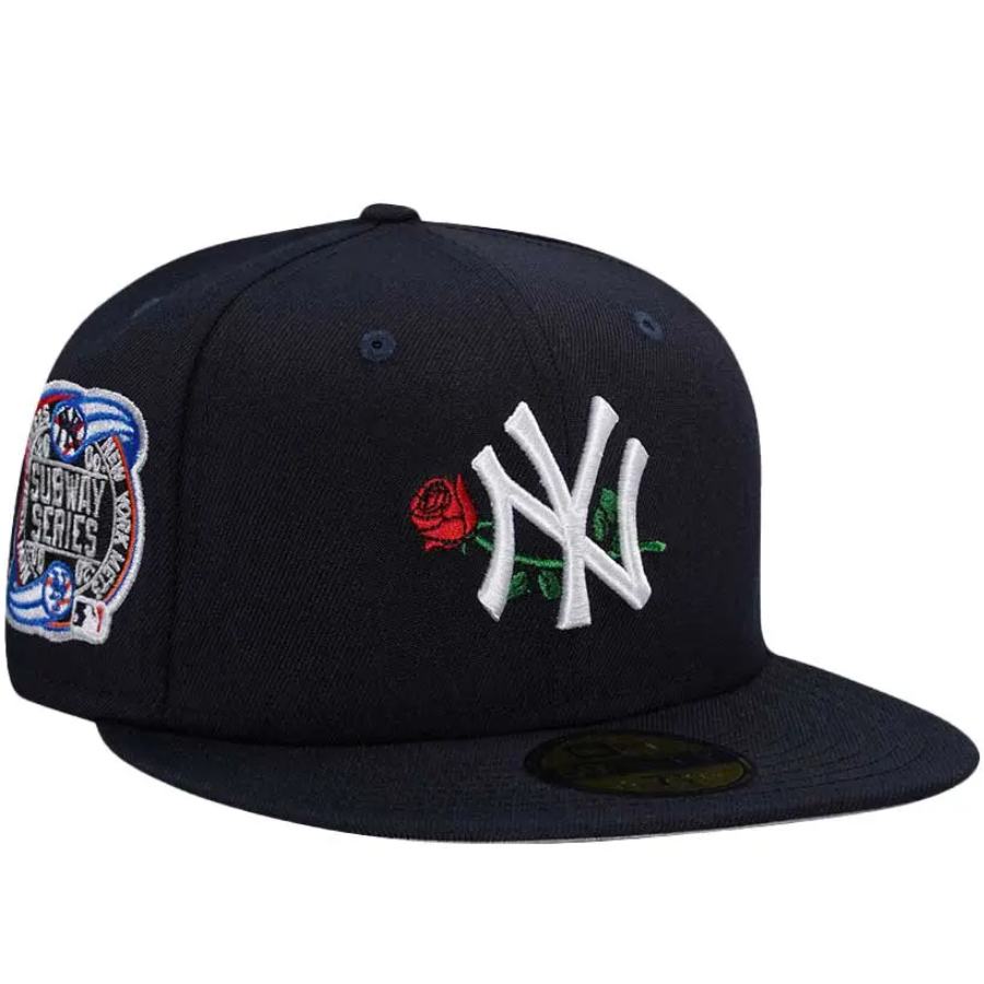 This New York Yankees fitted hat was released by Topperz Store. The fitted has a navy blue six panel structured high crown and embroidered eyelets with a navy blue fabric squatchee button. The fitted cap also has a navy blue flat bill with a gray undervisor and black sweatband. The front panel features the New York Yankees logo embroidery alongside a red rose and a 2000 Subway Series side patch on the right panel. The left panel of the fitted displays the New Era logo and the official MLB logo embroidery on the rear crown.