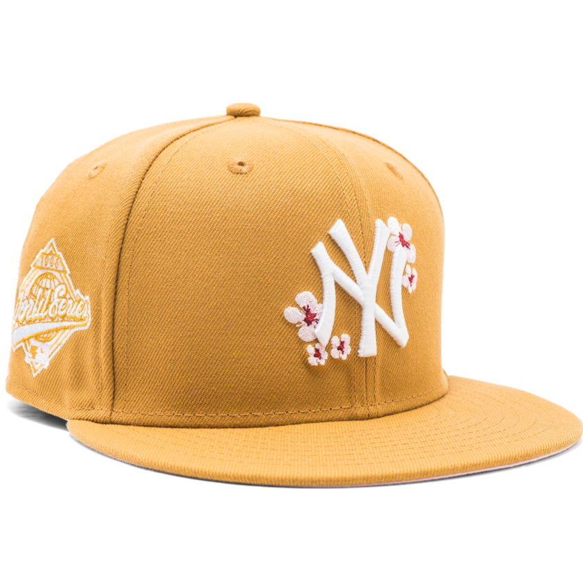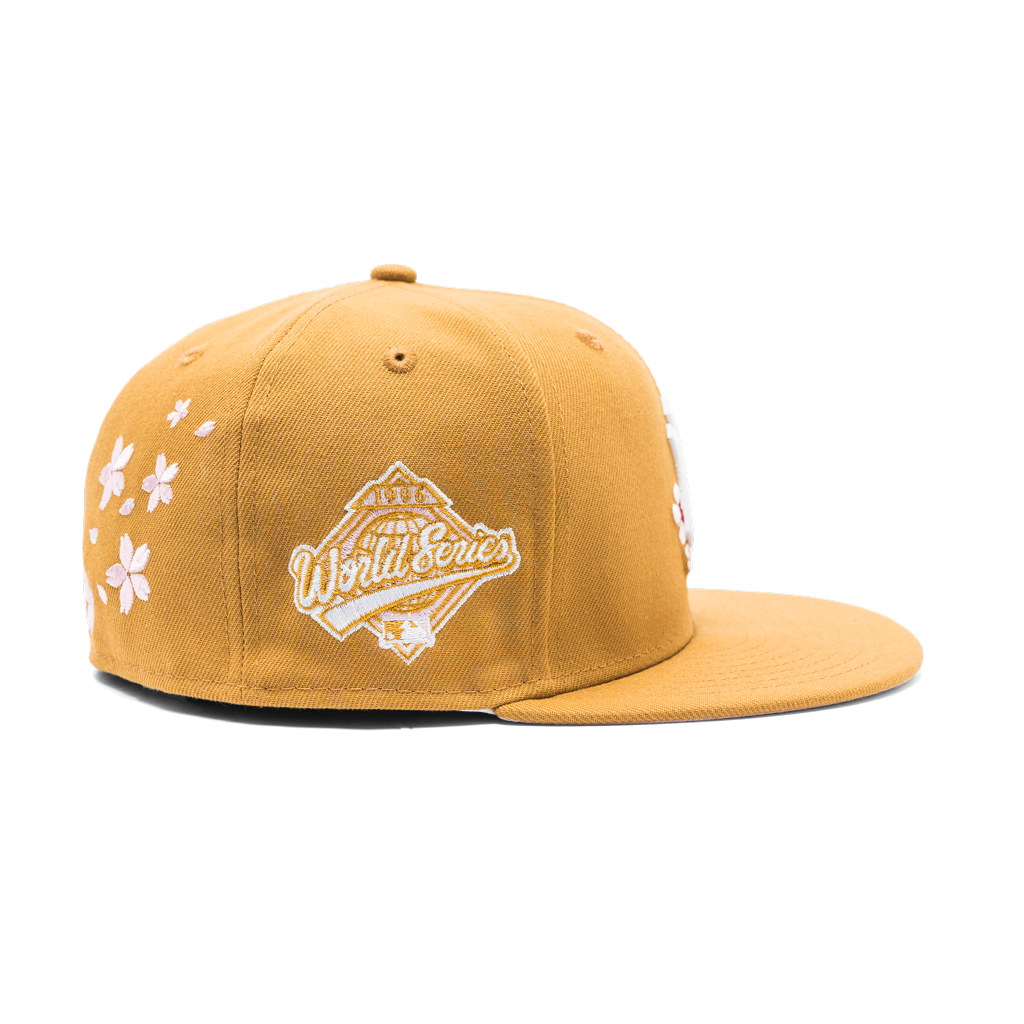 This New Era New York Yankees 59FIFTY fitted hat has a wheat six panel structured high crown, embroidered eyelets and fabric squatchee button. The flat bill of the fitted is also wheat with a soft pink undervisor and white sweatband. The front panel features the NY Yankees logo embroidered in white in front of soft pink cherry blossom embroidery. The right panel features a World Series side patch embroidery.