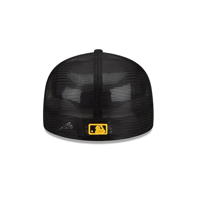 The Pittsburgh Pirates 2023 Batting Practice 59FIFTY Fitted Cap features an embroidered Pirates logo at the front panels with a matching MLB Batterman logo at the rear and a gray undervisor.