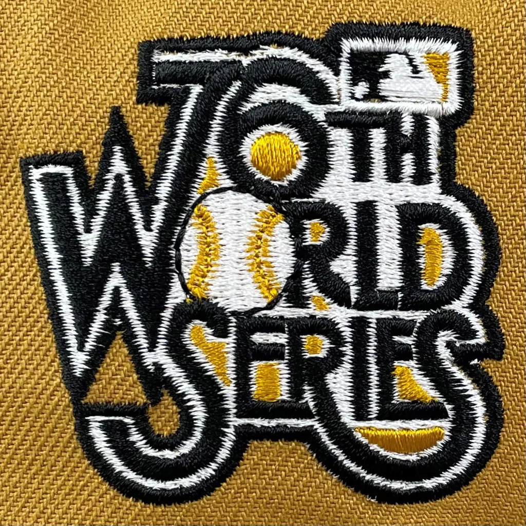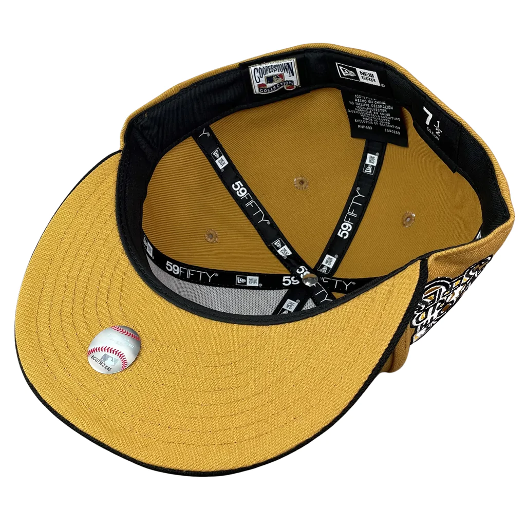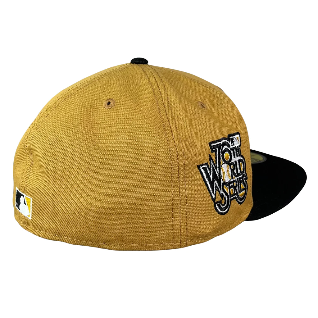 This New Era Pittsburgh Pirates Panama Tan/Black 1979 World Series 59FIFTY Fitted Hat has a Panama Tan six panel structured high crown and embroidered eyelets with a black fabric squatchee button. The fitted cap has a black flat bill with a tan undervisor. The front panel features the Pittsburgh Pirates logo embroidery and a 1979 World Series side patch embroidery on the right panel. The left panel of the fitted displays the New Era logo and the official MLB logo embroidery on the rear crown.
