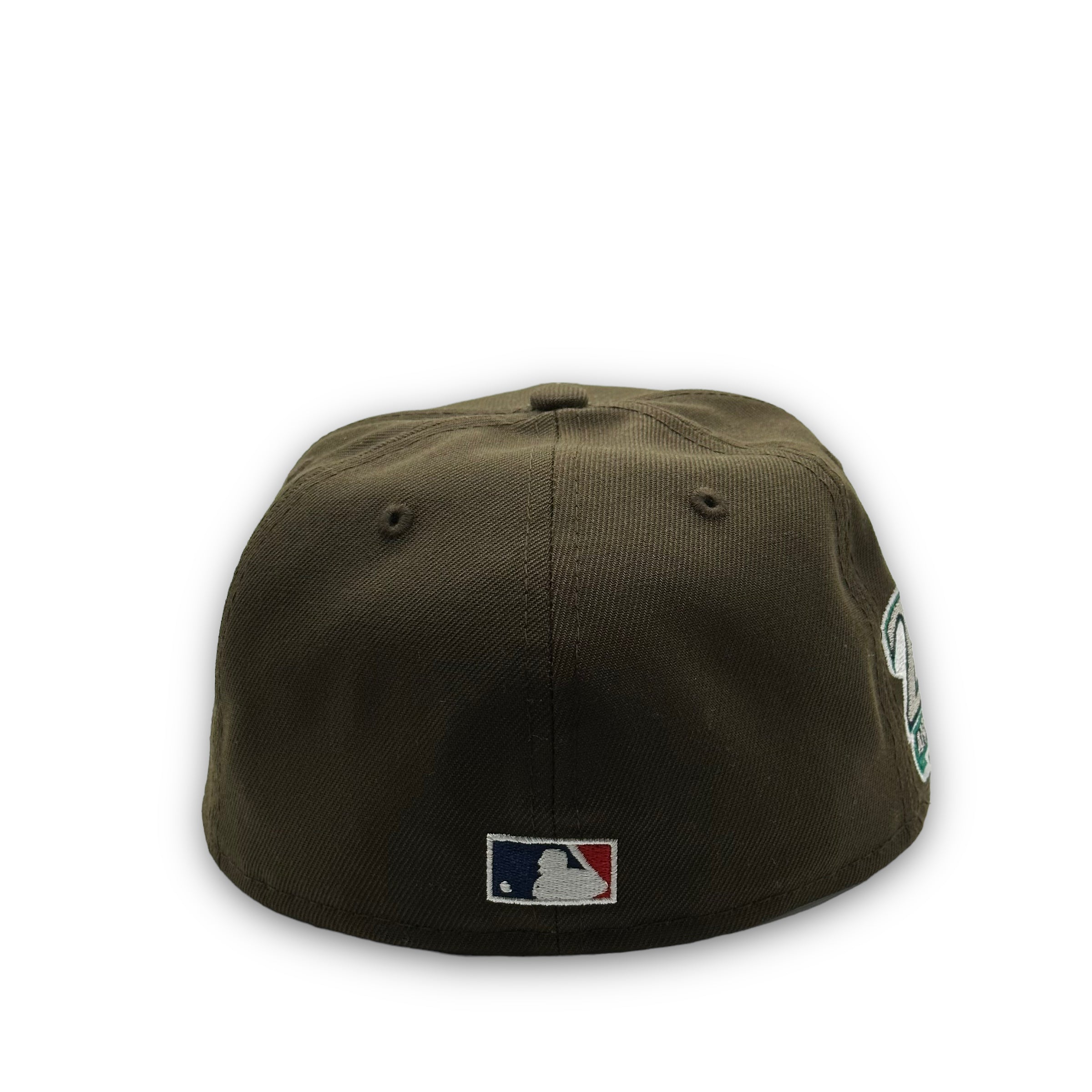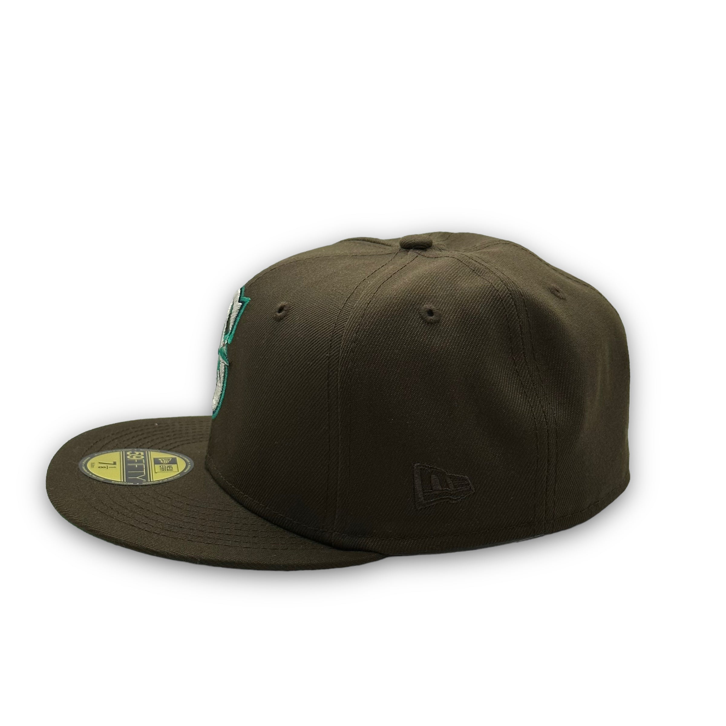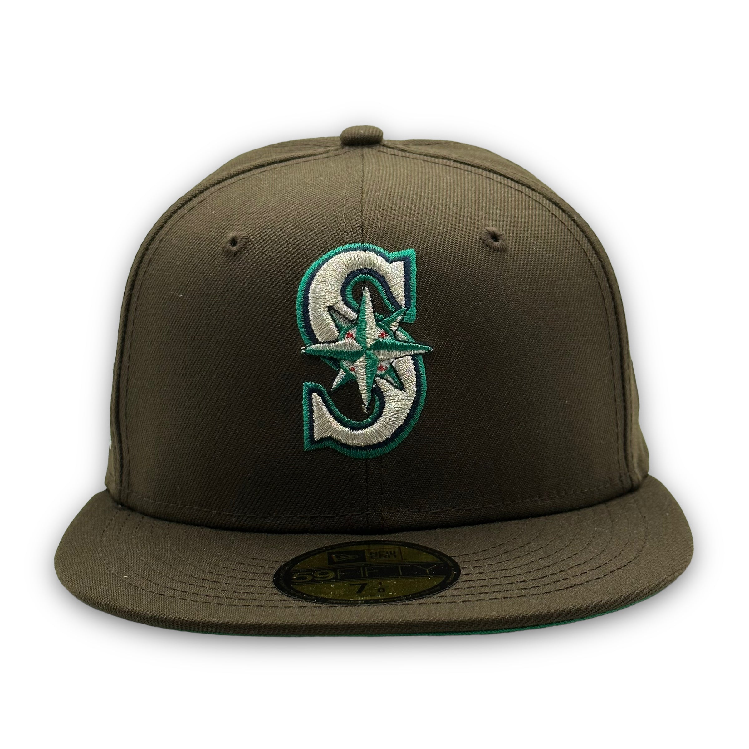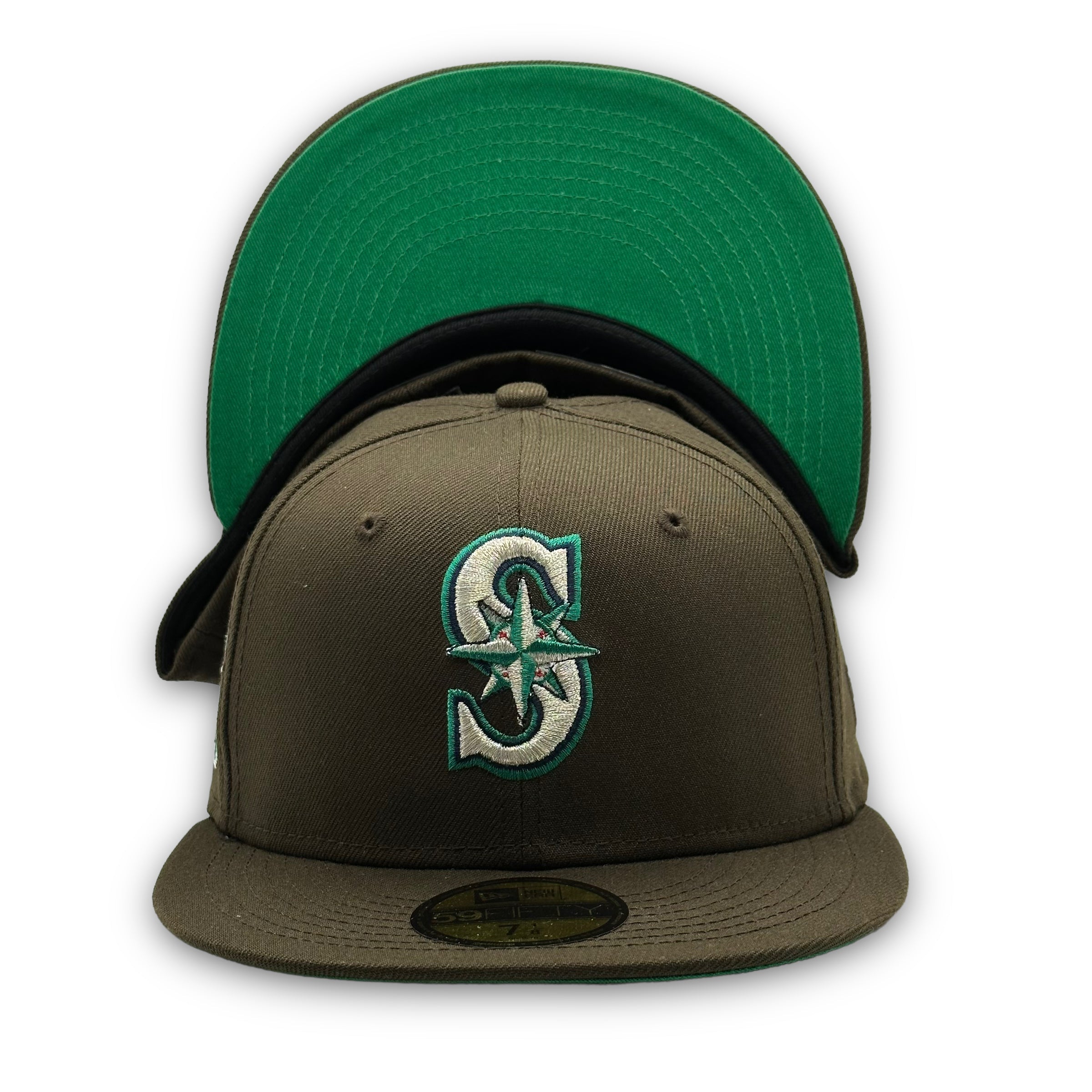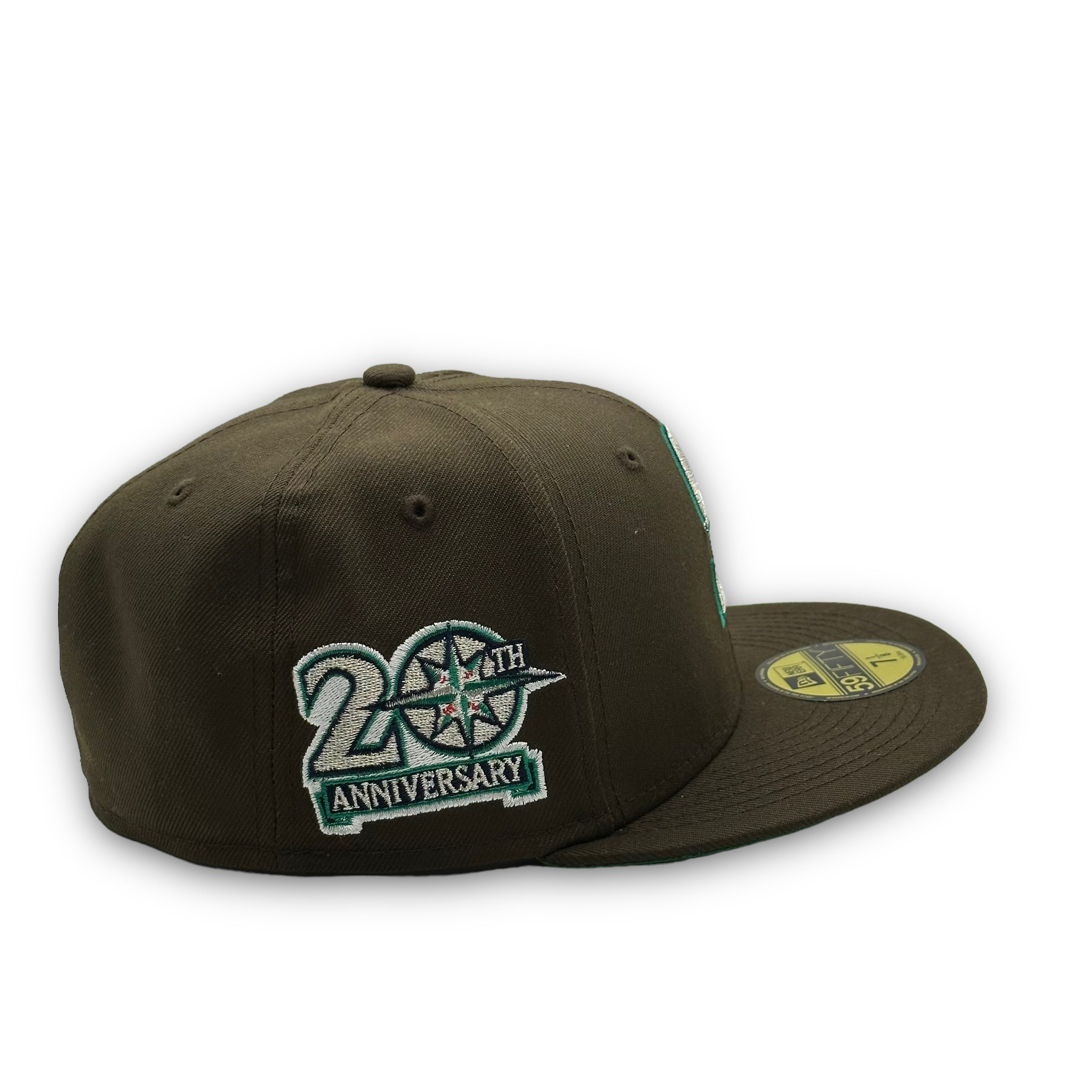 This New Era Seattle Mariners 20th Anniversary 'Kiwi Pack' 59FIFTY Fitted Hat was released by Burdeens Chicago. The fitted has a walnut brown six panel structured high crown, embroidered eyelets with and fabric squatchee button. The flat bill of the fitted cap is also walnut brown with a green bottom undervisor. The front panel features the Seattle Mariners logo embroidery and a side patch embroidered on the right panel. The left panel of the fitted displays the New Era logo and the official Seattle Mariners script embroidered on the rear crown.