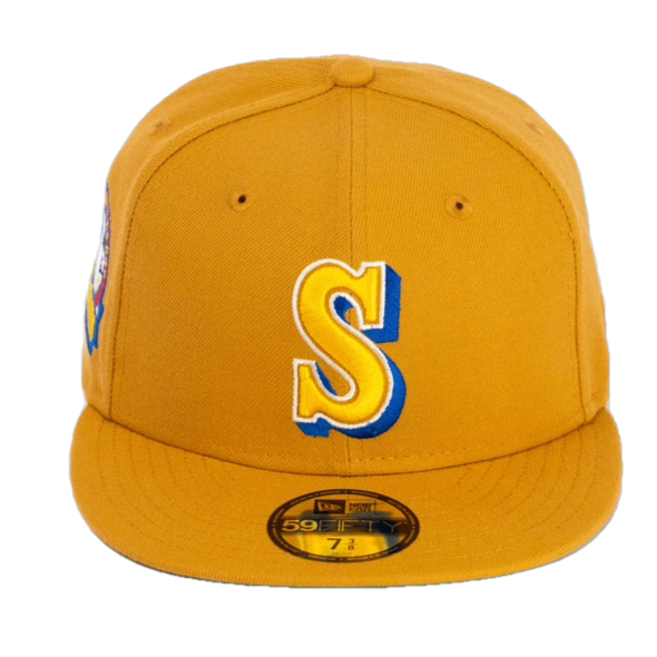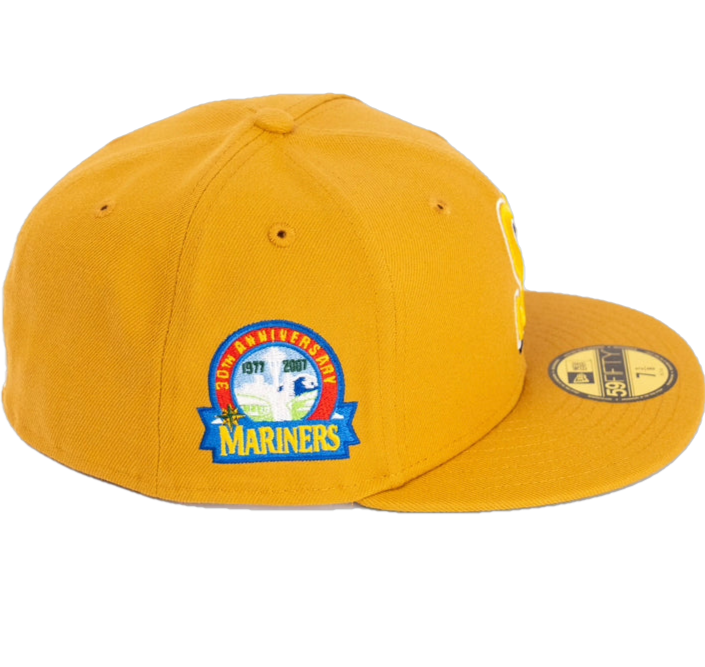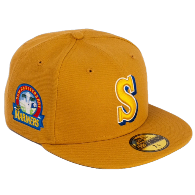 This New Era Seattle Mariners 'Movie Pack' Panama tan 30th Anniversary 59FIFTY Fitted Hat was released by Energie. The fitted has a six panel structured high crown and embroidered eyelets with a fabric squatchee button. The fitted cap has a flat bill with a undervisor and sweatband. The front panel features the Seattle Mariners logo embroidery. The left panel of the fitted displays the New Era logo and the official MLB logo embroidery on the rear crown.