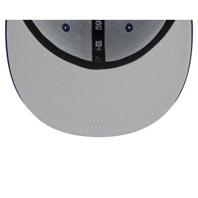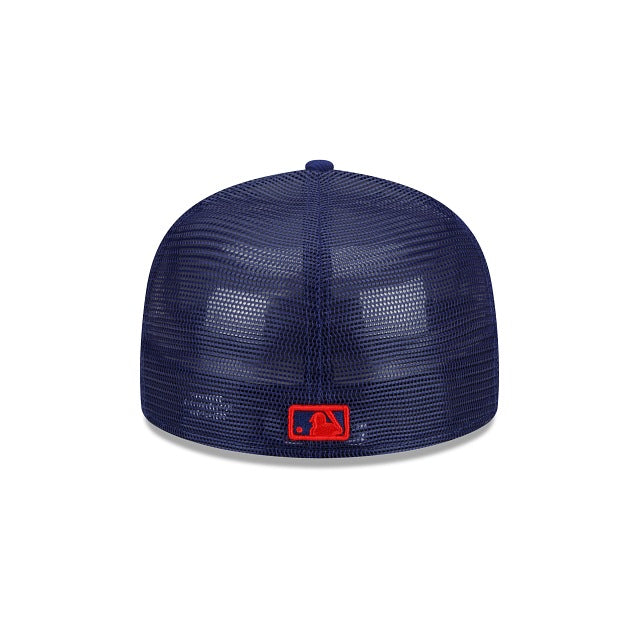 The Texas Rangers 2023 Batting Practice 59FIFTY Fitted Cap features an embroidered Rangers logo at the front panels with a matching MLB Batterman logo at the rear and a gray undervisor.