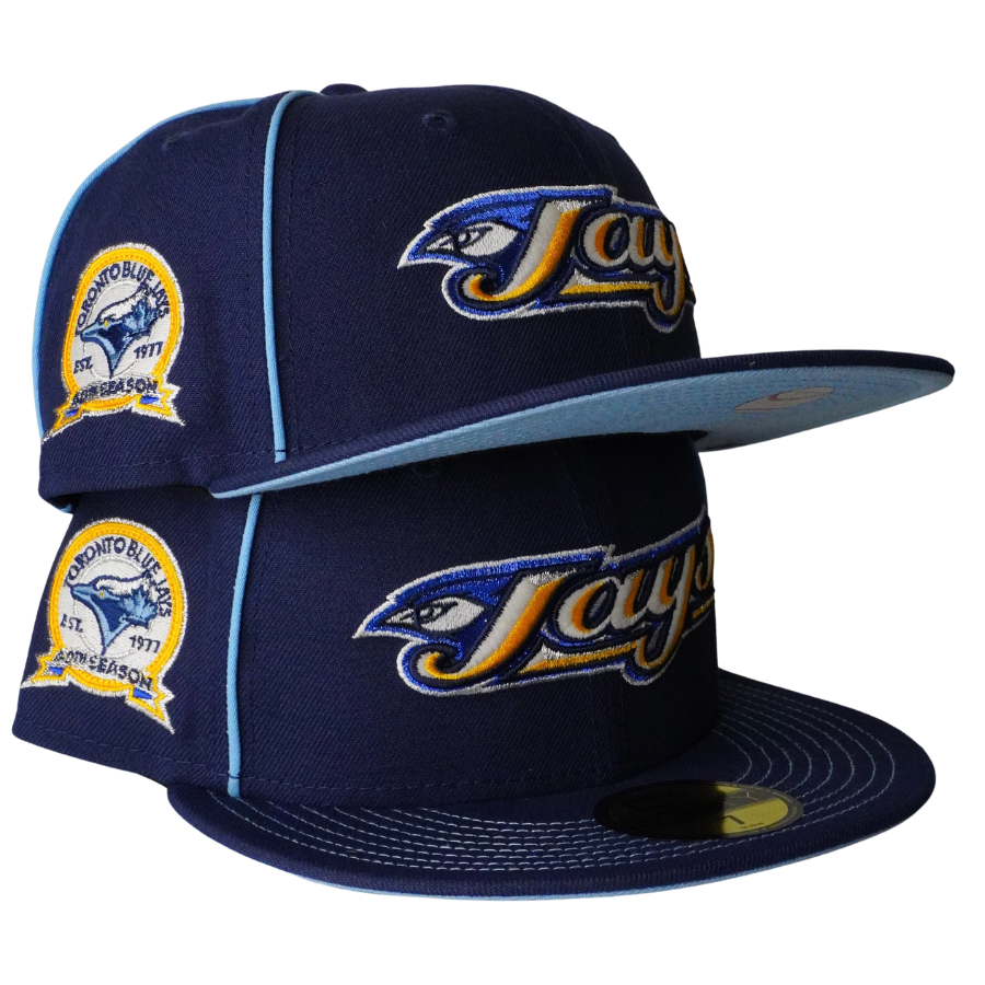 This Toronto Blue Jays fitted hat was released by Capanova. The fitted has a navy blue six panel structured high crown with light blue stripes, navy blue embroidered eyelets and fabric squatchee button. The flat bill of the cap is also navy blue with a baby blue undervisor. The front panel features the Toronto Blue Jays logo embroidery and a 40th Season side patch embroidery on the right panel. The left panel of the fitted displays the New Era logo and the official MLB Batterman logo embroidery on the rear crown.