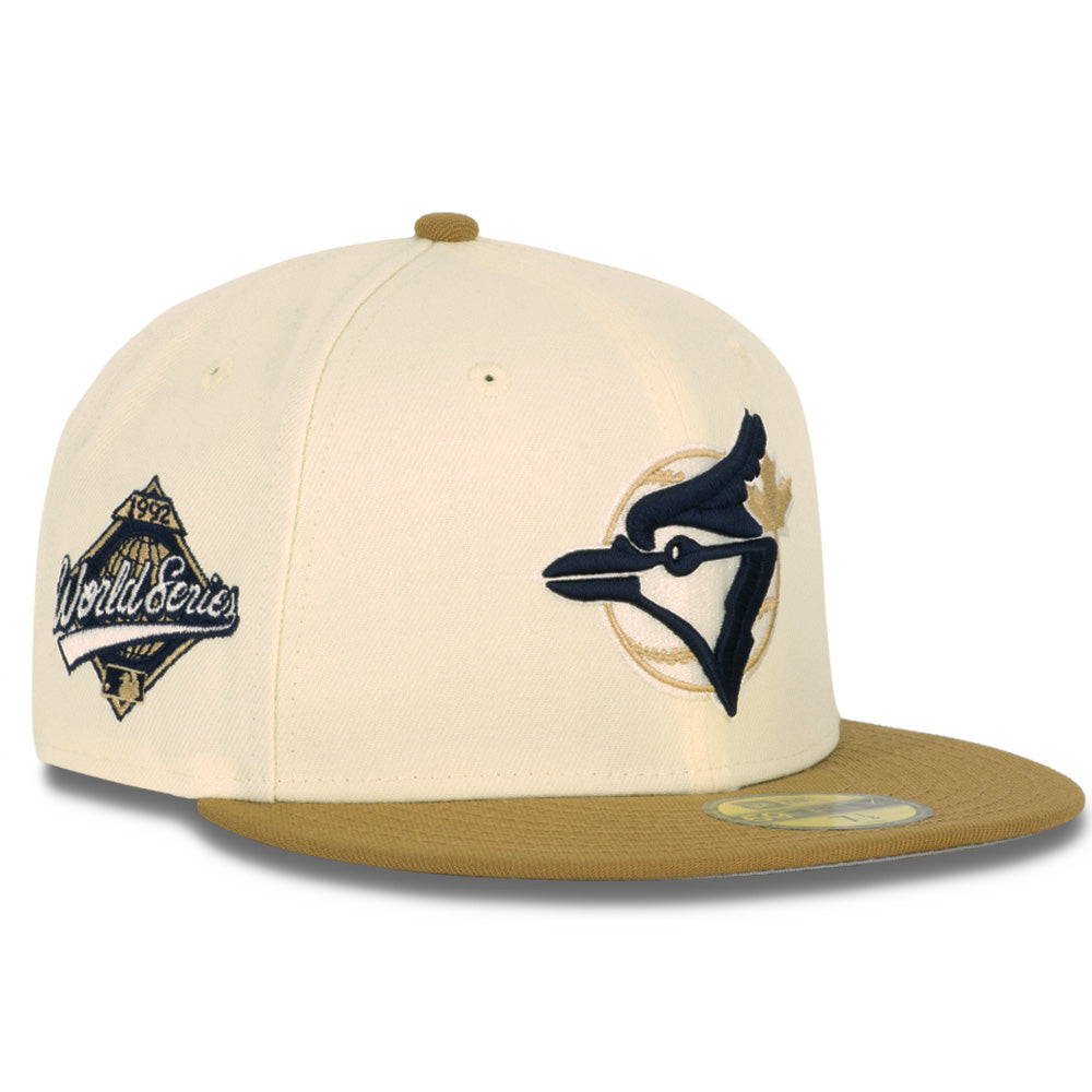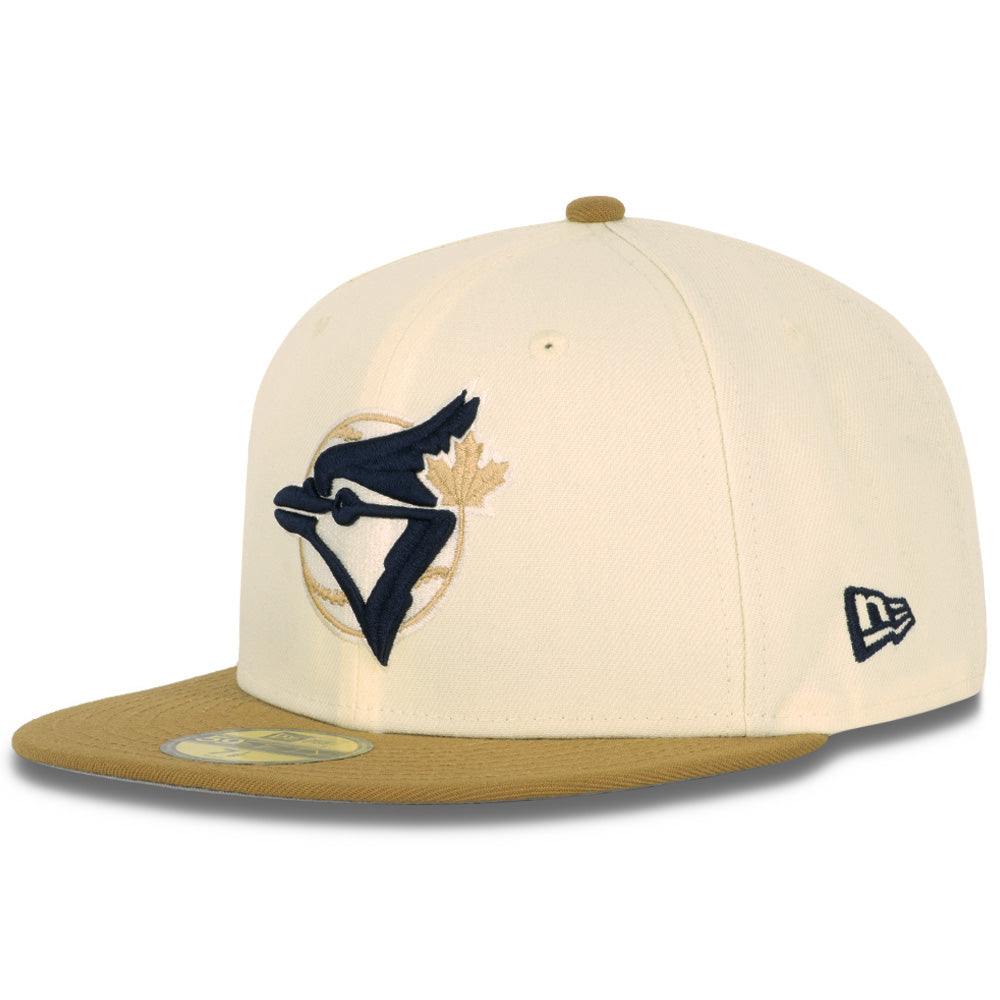 This New Era Toronto Blue Jays Harvester 2023 59FIFTY Fitted Hat was released by Just Sports. The fitted has a cream six panel structured high crown and embroidered eyelets with a tan fabric squatchee button. The flat bill of the fitted cap is also tan. The front panel features the Toronto Blue Jays logo embroidered in tan and midnight navy blue stitching. The left panel of the fitted displays the New Era logo and celebratory side patch on the right panel.