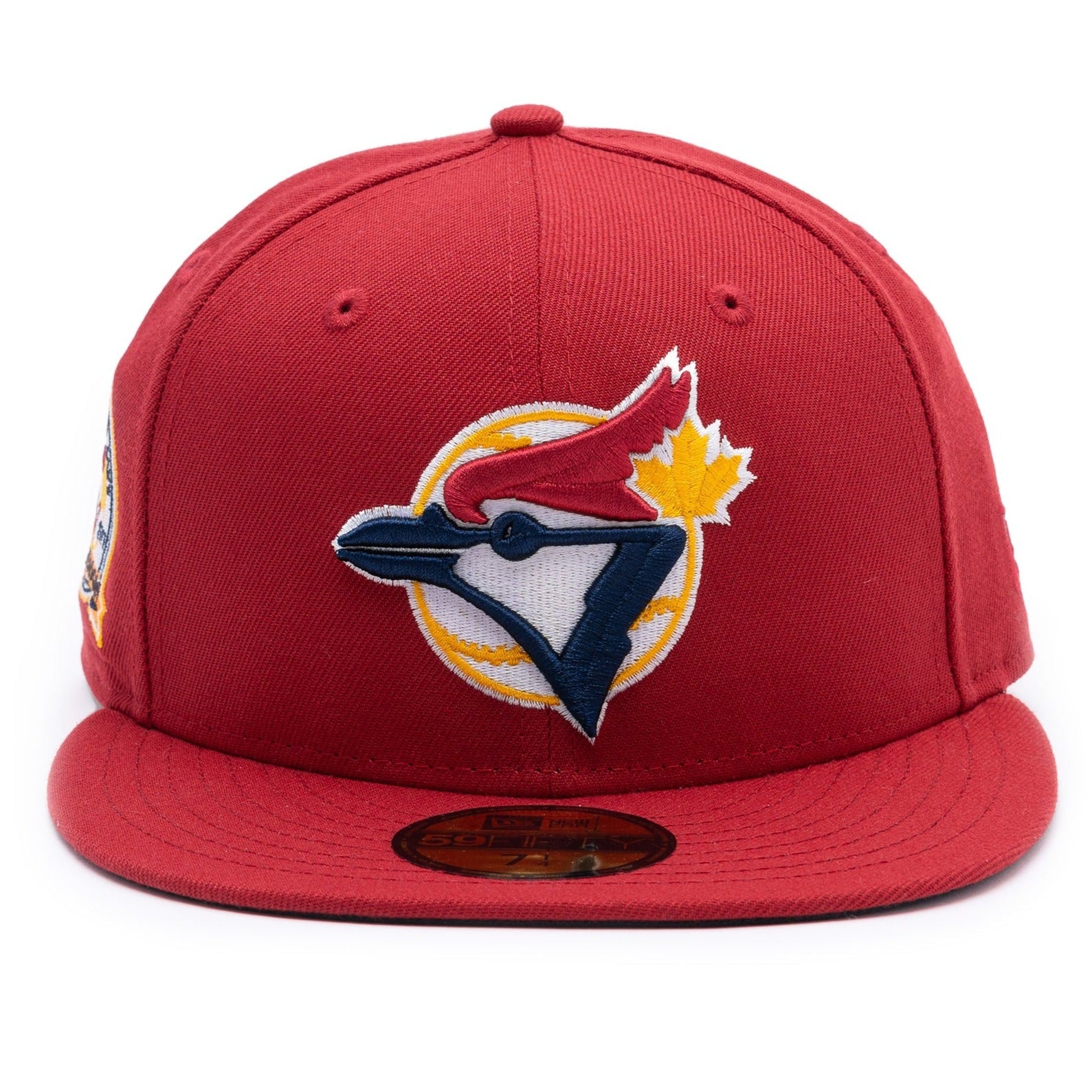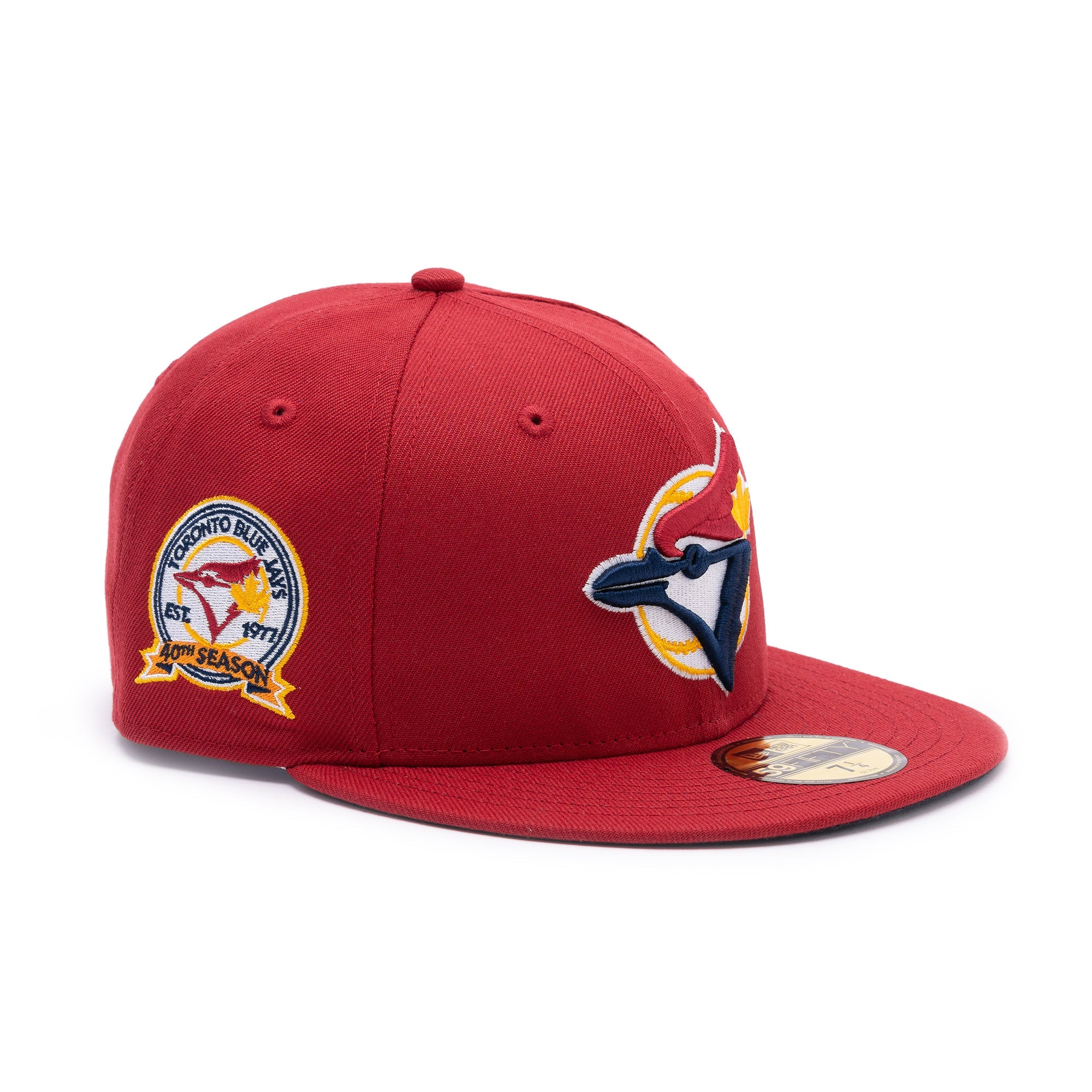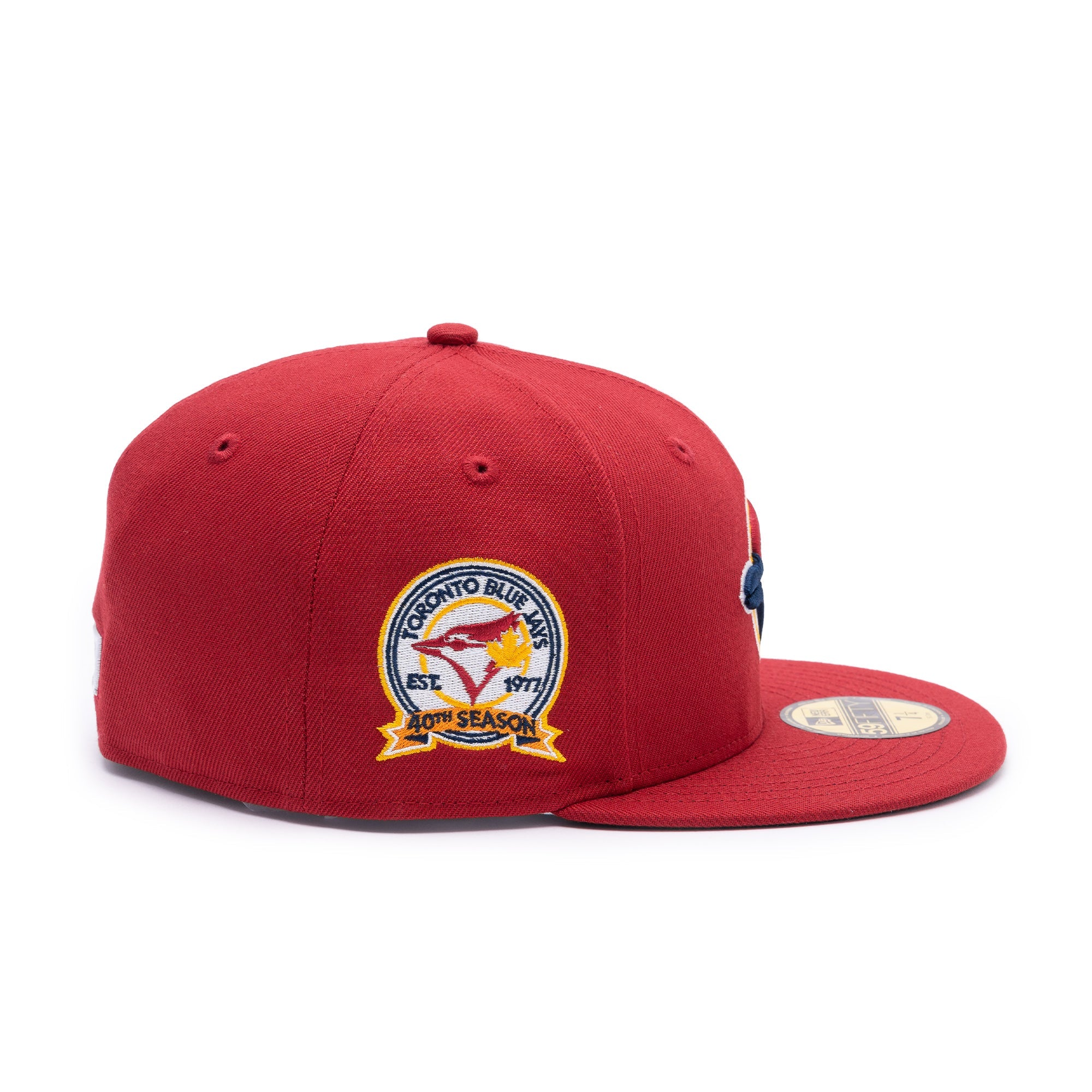 This New Era Toronto Blue Jays 59FIFTY fitted hat has a pinot red six panel structured high crown, embroidered eyelets and fabric squatchee button. The flat bill of the fitted cap is also pinot red with a navy blue undervisor and white sweatband. The front panel features the Toronto Blue Jays logo embroidery with a 40th Anniversary side patch on right panel.