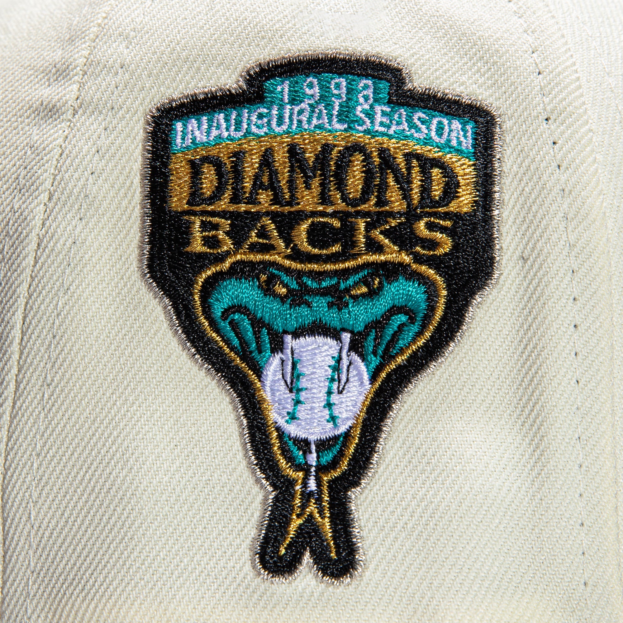 This New Era Tropics Arizona Diamondbacks Inaugural Hat 59FIFTY Fitted Hat is a Hat Club exclusive. The fitted has a white six panel structured high crown with teal embroidered eyelets and fabric squatchee button. The fitted cap has a black flat bill with a teal undervisor and black sweatband. The front panel features the Arizona Diamondbacks logo embroidery and a side patch embroidery on the right panel. The left panel of the fitted displays the New Era logo and the official MLB logo embroidery on the rear crown.