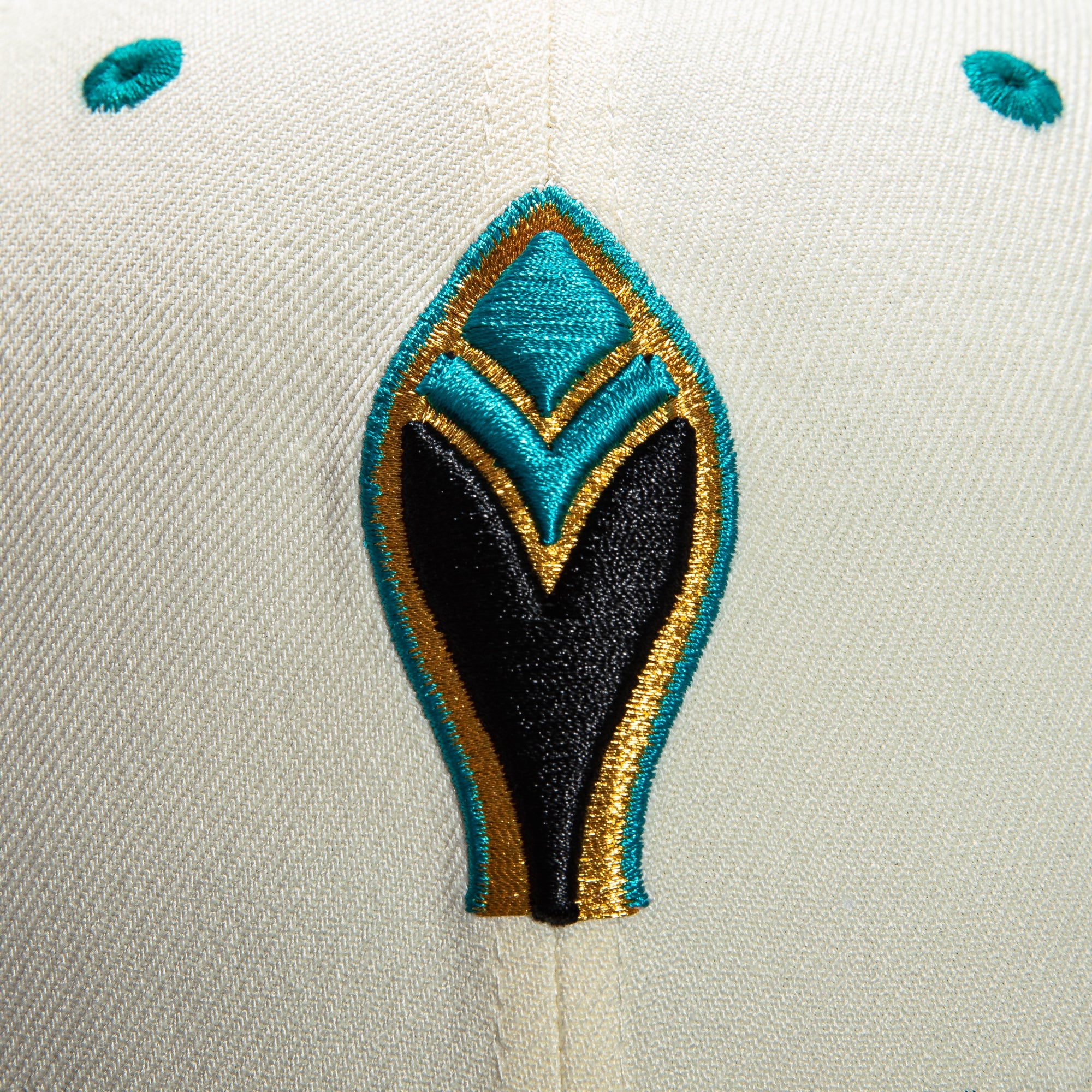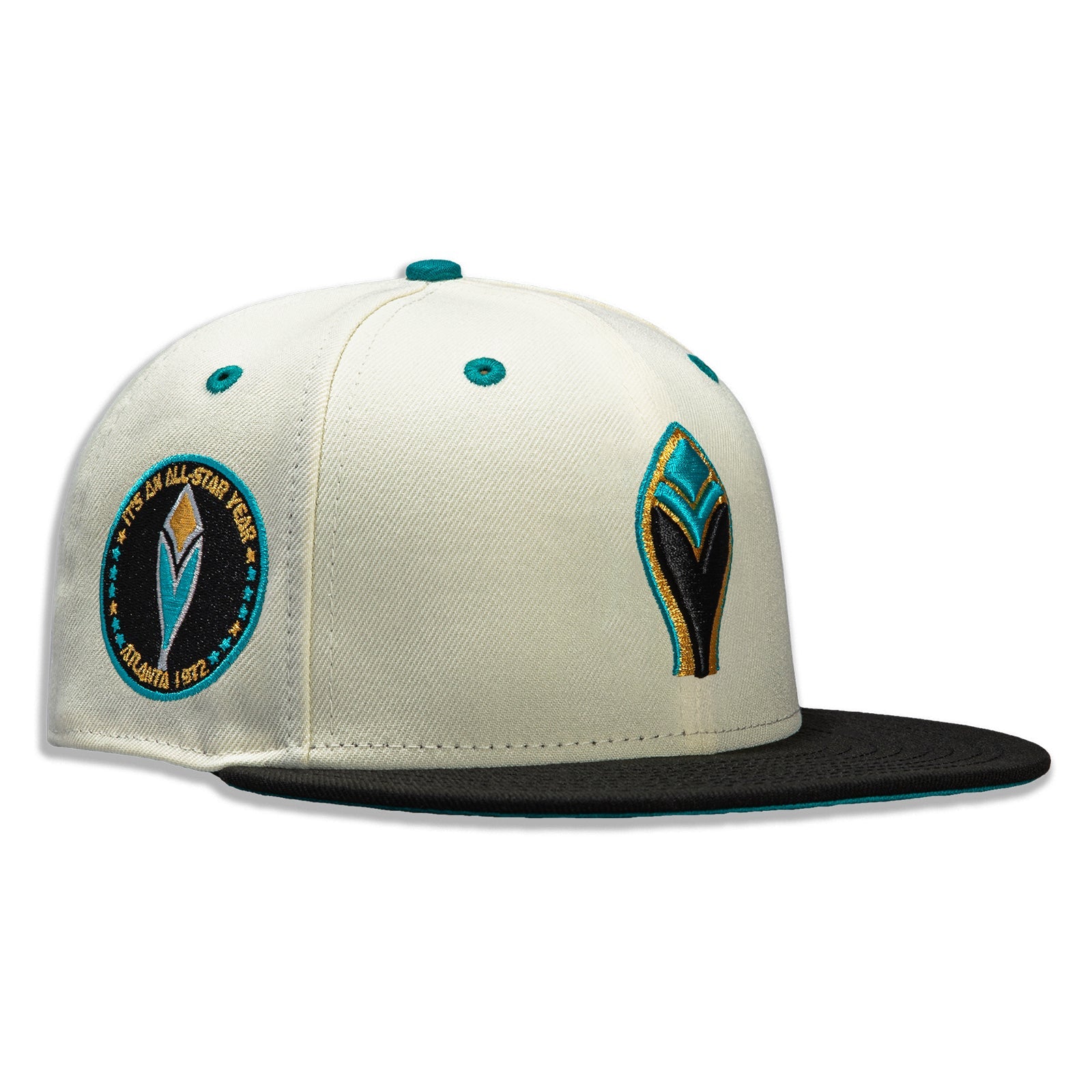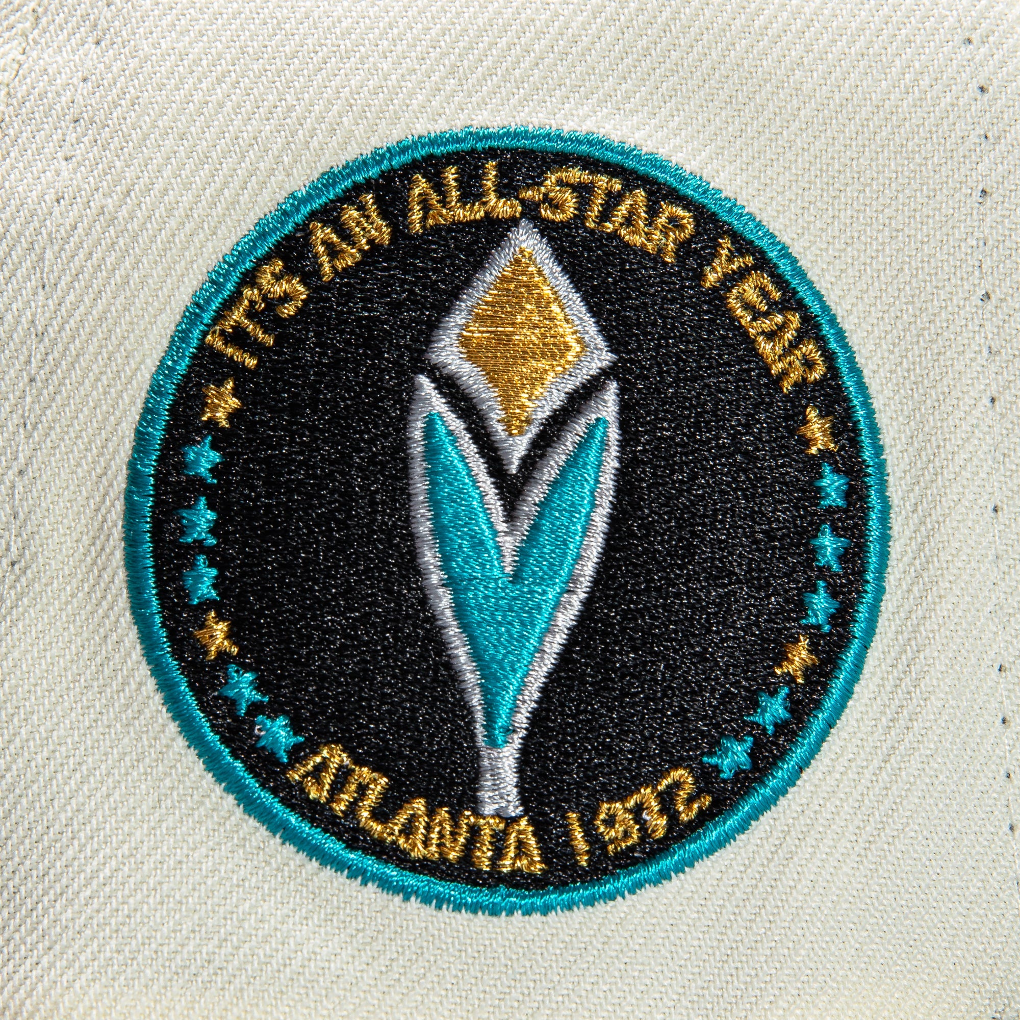 This New Era Tropics Atlanta Braves 1972 All-Star Game 59FIFTY Fitted Hat is a Hat Club exclusive. The fitted  has a white six panel structured high crown with teal embroidered eyelets and fabric squatchee button. The fitted cap has a black flat bill with a teal undervisor and black sweatband. The front panel features the Atlanta Braves logo embroidery and a  side patch embroidery on the right panel. The left panel of the fitted displays the New Era logo and the official MLB logo embroidery on the rear crown.