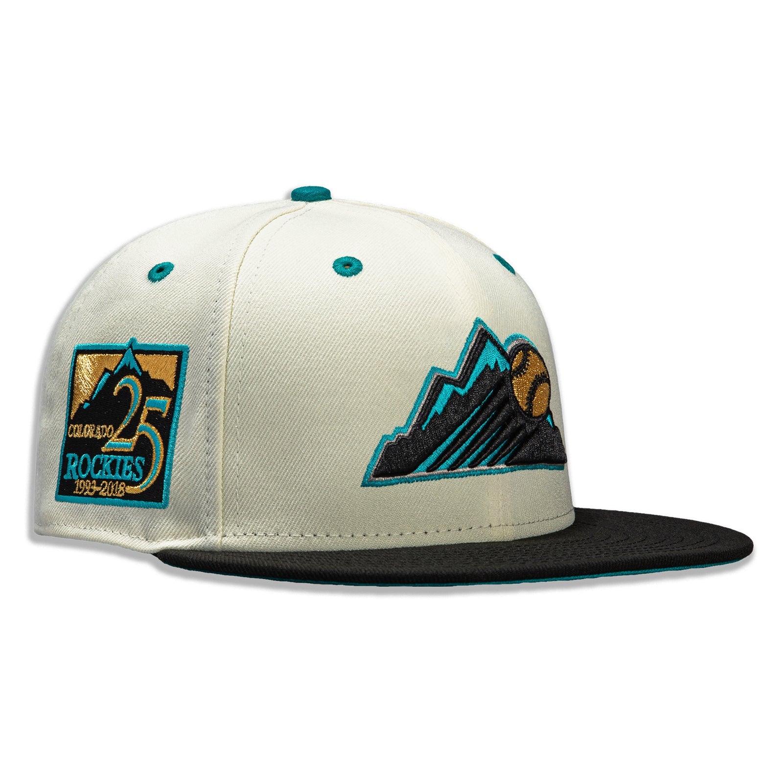 This New Era Tropics Colorado Rockies 25th Anniversary 59FIFTY Fitted Hat is a Hat Club exclusive. The fitted  has a white six panel structured high crown with teal embroidered eyelets and fabric squatchee button. The fitted cap has a black flat bill with a teal undervisor and black sweatband. The front panel features the Colorado Rockies logo embroidery and a  side patch embroidery on the right panel. The left panel of the fitted displays the New Era logo and the official MLB logo embroidery on the rear crown.