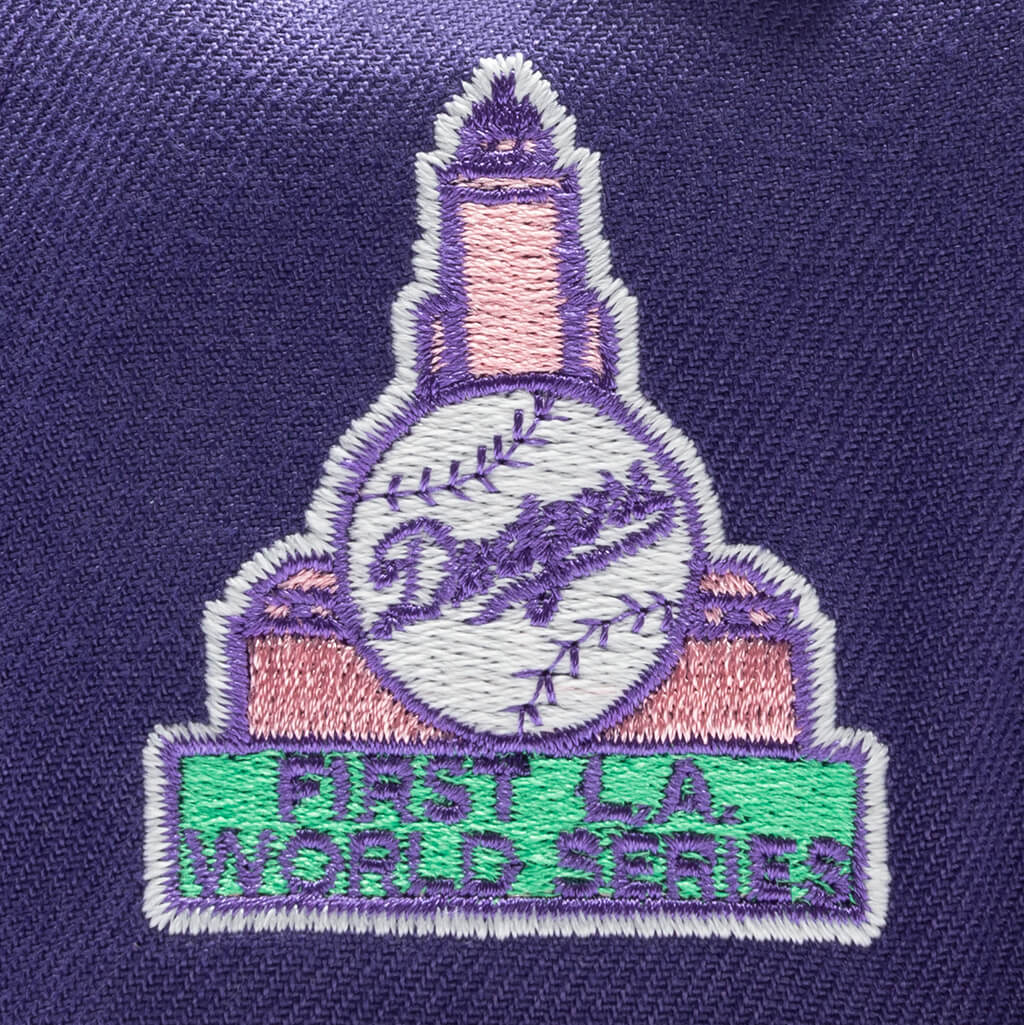 This New Era x Feature Los Angeles Dodgers Northern Lights 59FIFTY Fitted Hat was released by Feature. The Northern Lights fitted has a light navy blue six panel structured high crown, grey embroidered eyelets and light navy blue flat bill. The fitted cap has a grey bottom undervisor with a black sweatband . The front panel features the Los Angeles Dodgers logo embroidery and a side patch embroidered on the right panel. The left panel of the fitted displays the New Era logo and the official MLB logo embroidery on the rear crown.