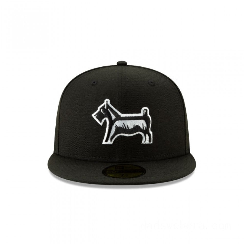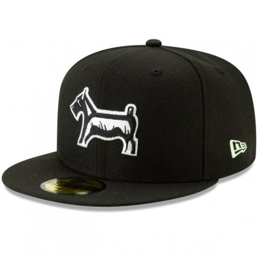 The New Era Monopoly Scottie Dog 59FIFTY Fitted Hat has a an all black six panel structured high crown including the fabric squatchee button located at the top of the crown and the flat bill. The front panel features the popular Monopoly Scottie Dog board game piece.