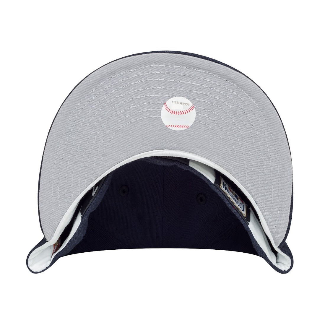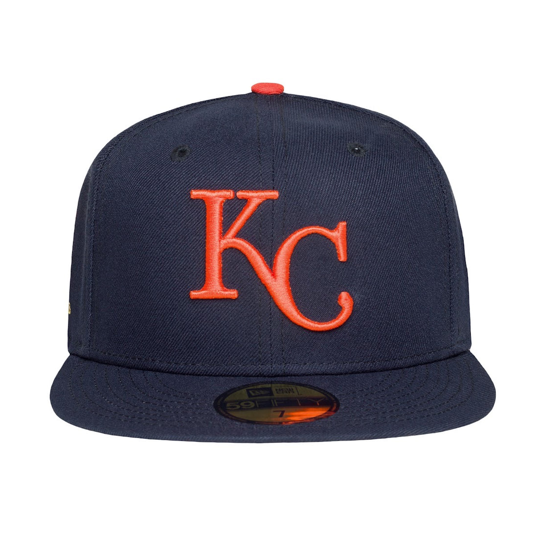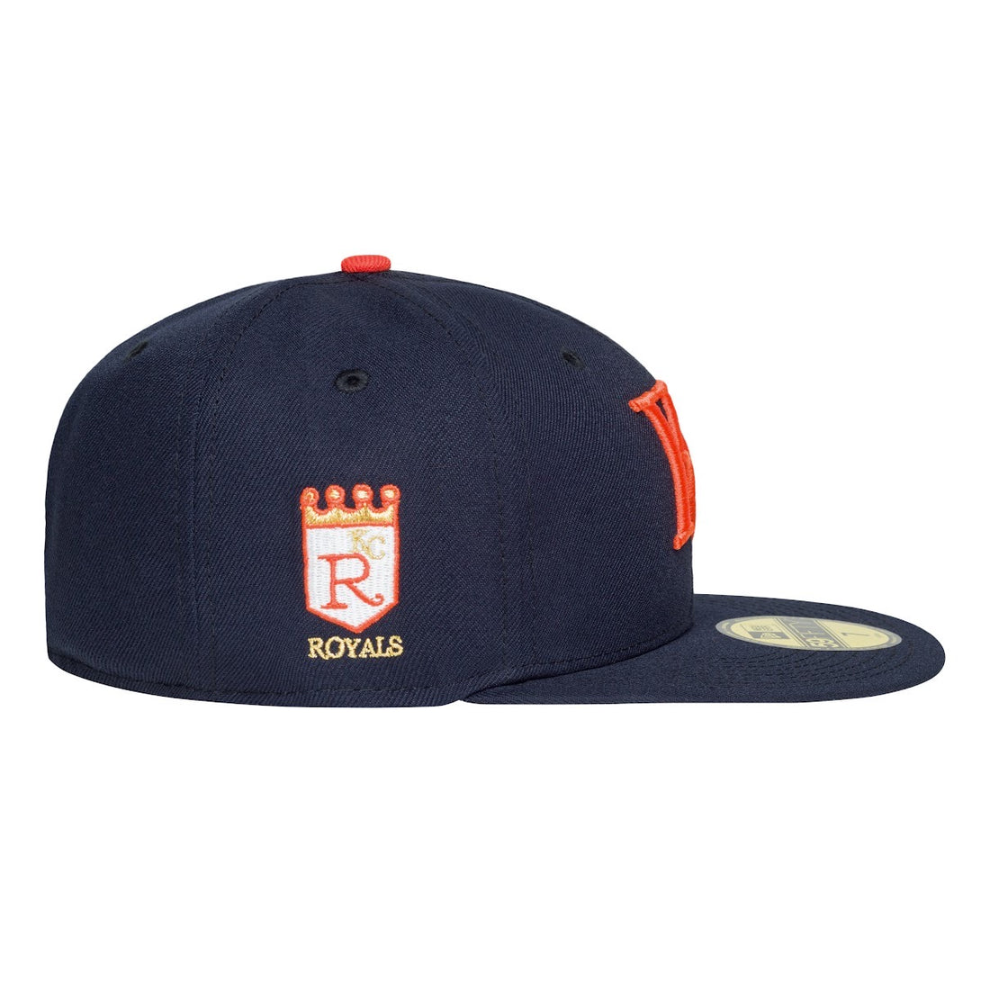 This Kansas City Royals 59FIFTY fitted hat was released by Leaders 1354. The fitted has a navy blue six panel structured high crown and embroidered eyelets with an orange fabric squatchee button. The fitted cap also has a navy blue flat bill with a grey undervisor and white sweatband. The front panel features the Kansas City Royals logo embroidery and a side patch embroidery on the right panel. The left panel of the fitted displays the New Era logo and the official MLB Batterman logo embroidery on the rear crown.