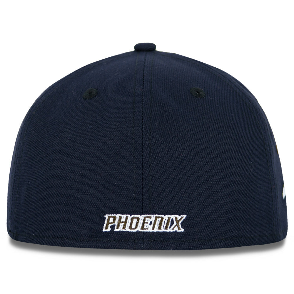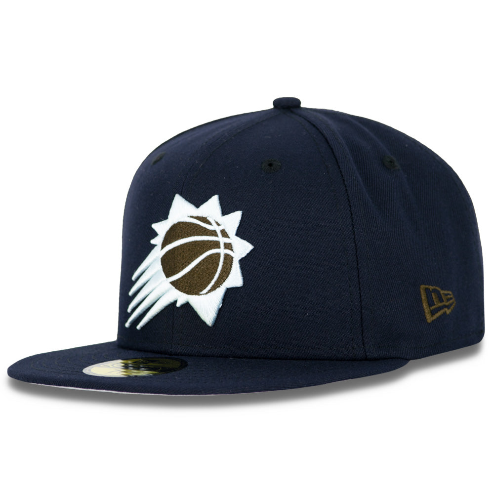 This New Era Phoenix Suns 'Arctic Tundra' 59FIFTY Fitted Hat was released by Just Sports. The fitted has a navy blue six panel structured high crown, embroidered eyelets and fabric squatchee button. The flat bill of the fitted cap is navy blue with a gray undervisor. The front panel features the Phoenix Suns logo embroidered in brown and white stitching and a side patch embroidery on the right panel in the same colorway as the primary logo. The left panel of the fitted displays the New Era logo and the Phoenix Suns