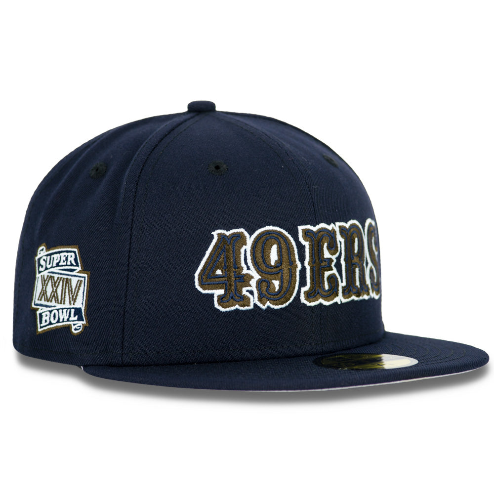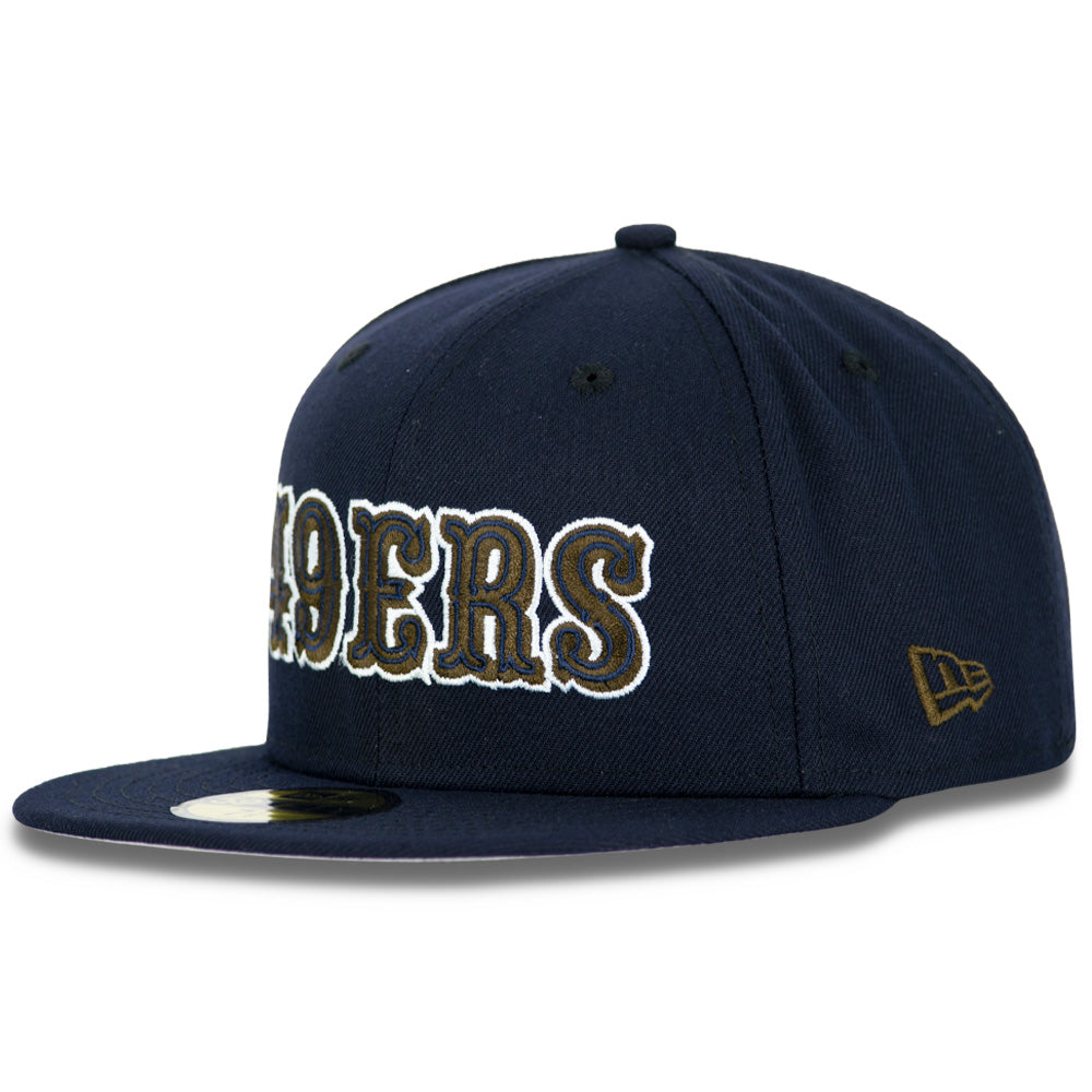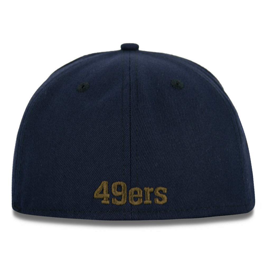This New Era San Francisco 49ers 'Arctic Tundra' 59FIFTY Fitted Hat was released by Just Sports. The fitted has a navy blue six panel structured high crown, embroidered eyelets and fabric squatchee button. The flat bill of the fitted cap is navy blue with a gray undervisor. The front panel features the San Francisco 49ers logo embroidered in brown and white stitching and a side patch embroidery on the right panel in the same colorway as the primary logo. The left panel of the fitted displays the New Era logo and the San Francisco 49ers