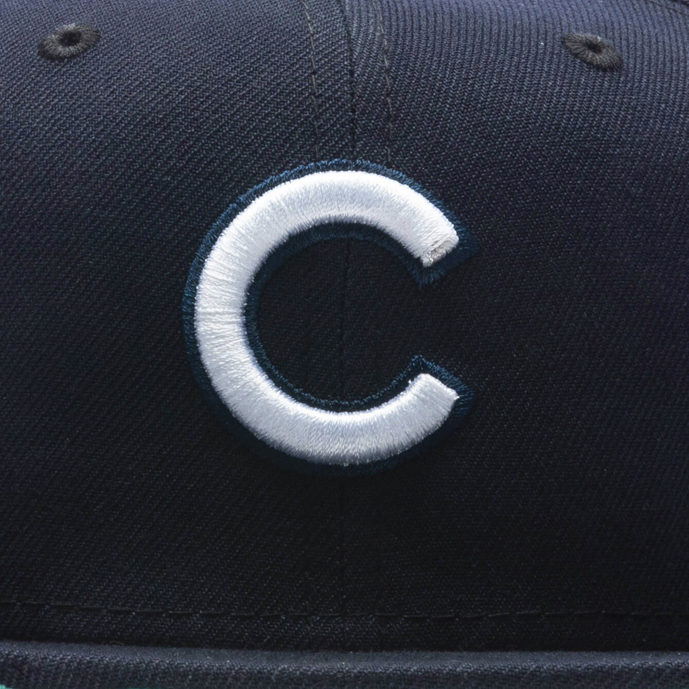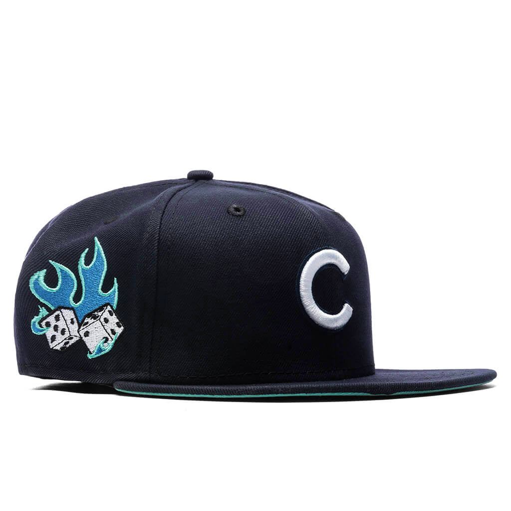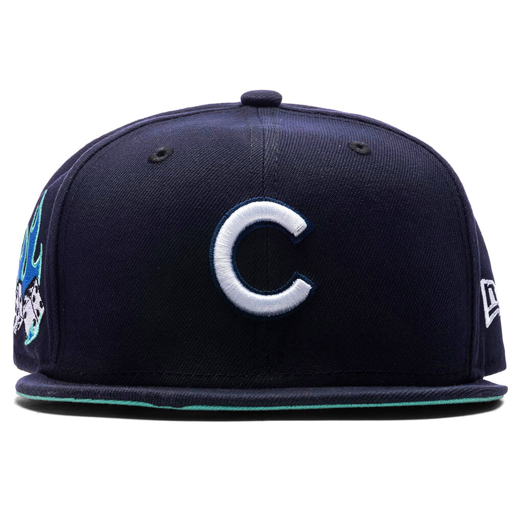 This Chicago Cubs 59FIFTY fitted hat was released by Feature. The fitted has a navy blue six panel structured high crown and embroidered eyelets with a navy blue fabric squatchee button. The fitted cap also has a navy blue flat bill with a clearmint undervisor and black sweatband. The front panel features the Chicago Cubs logo embroidery and flaming dice side patch embroidered in blue, white and clearmint tone on the right panel. The left panel of the fitted displays the New Era logo in white and the official Feature branded logo embroidery on the rear crown.