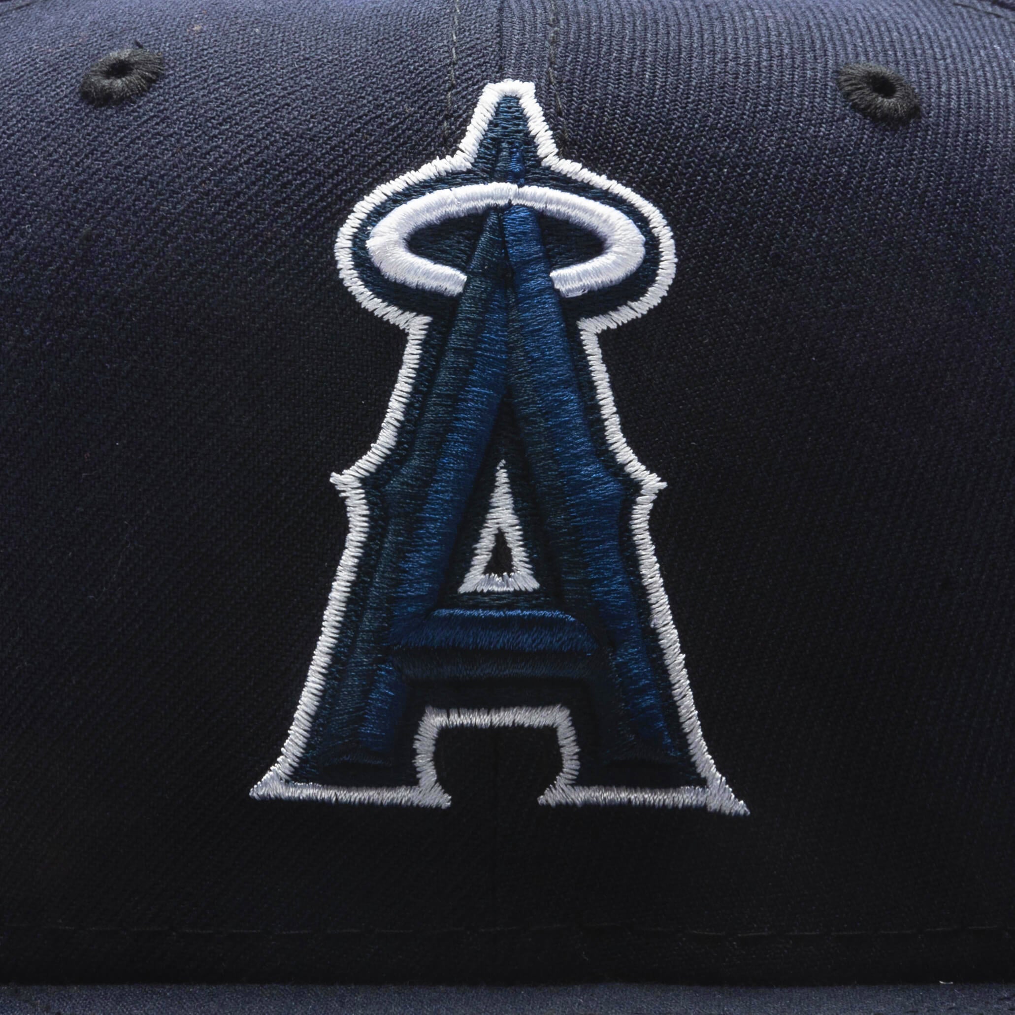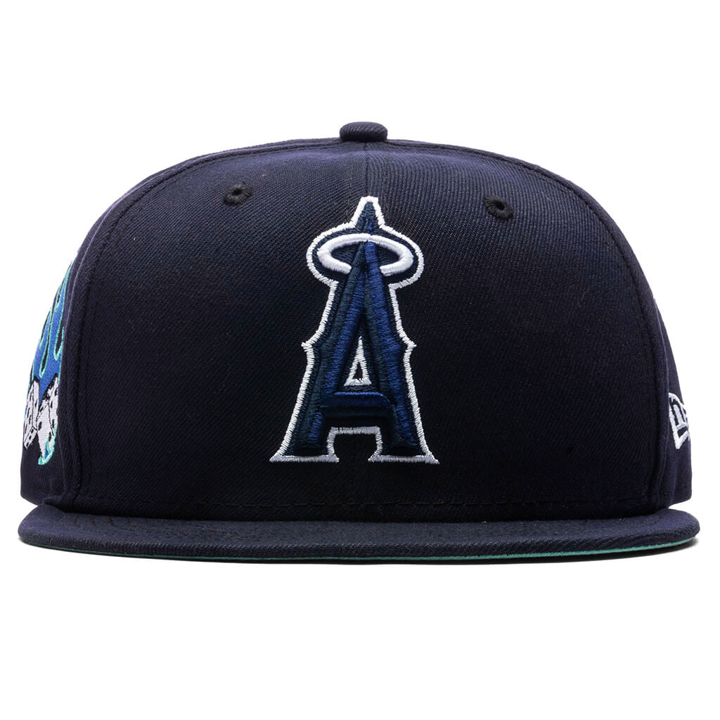 This Los Angeles Angels 59FIFTY fitted hat was released by Feature. The fitted has a navy blue six panel structured high crown and embroidered eyelets with a navy blue fabric squatchee button. The fitted cap also has a navy blue flat bill with a clearmint undervisor and black sweatband. The front panel features the Los Angeles Angels logo embroidery and flaming dice side patch embroidered in blue, white and clearmint tone on the right panel. The left panel of the fitted displays the New Era logo in white and the official Feature branded logo embroidery on the rear crown.