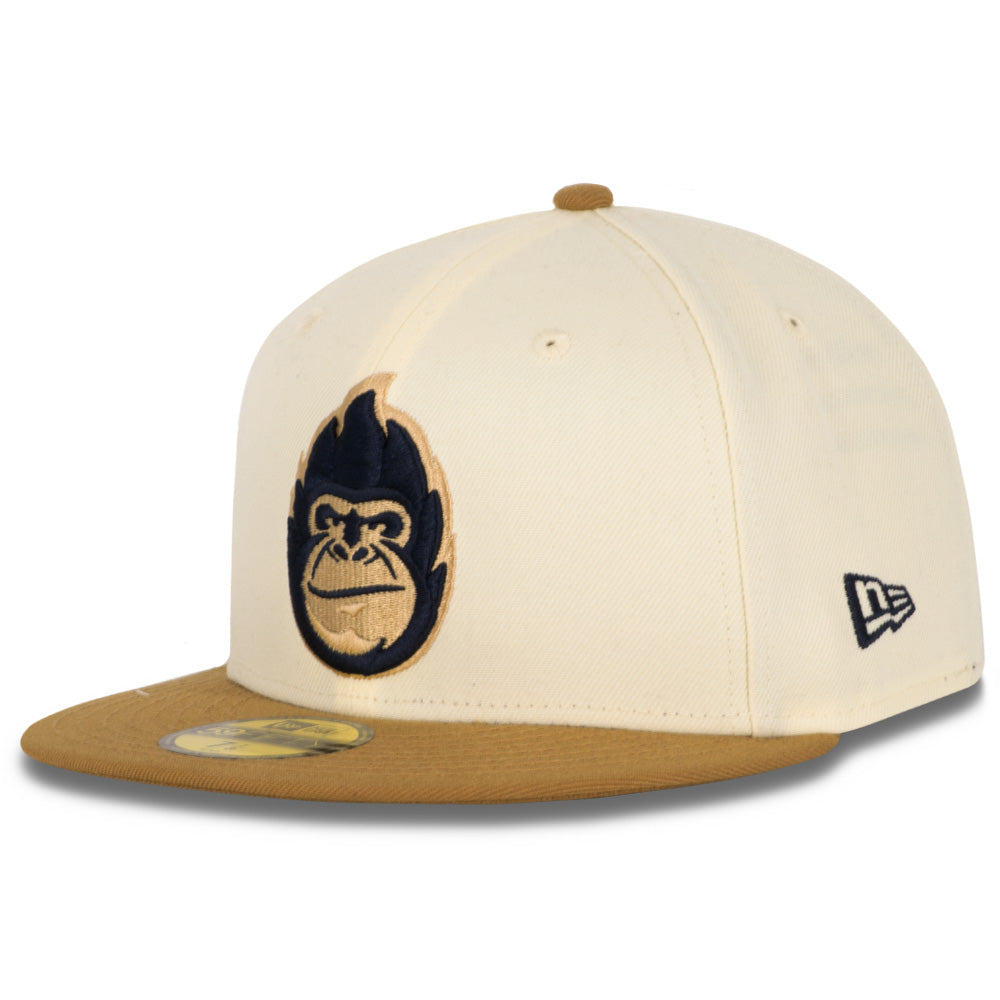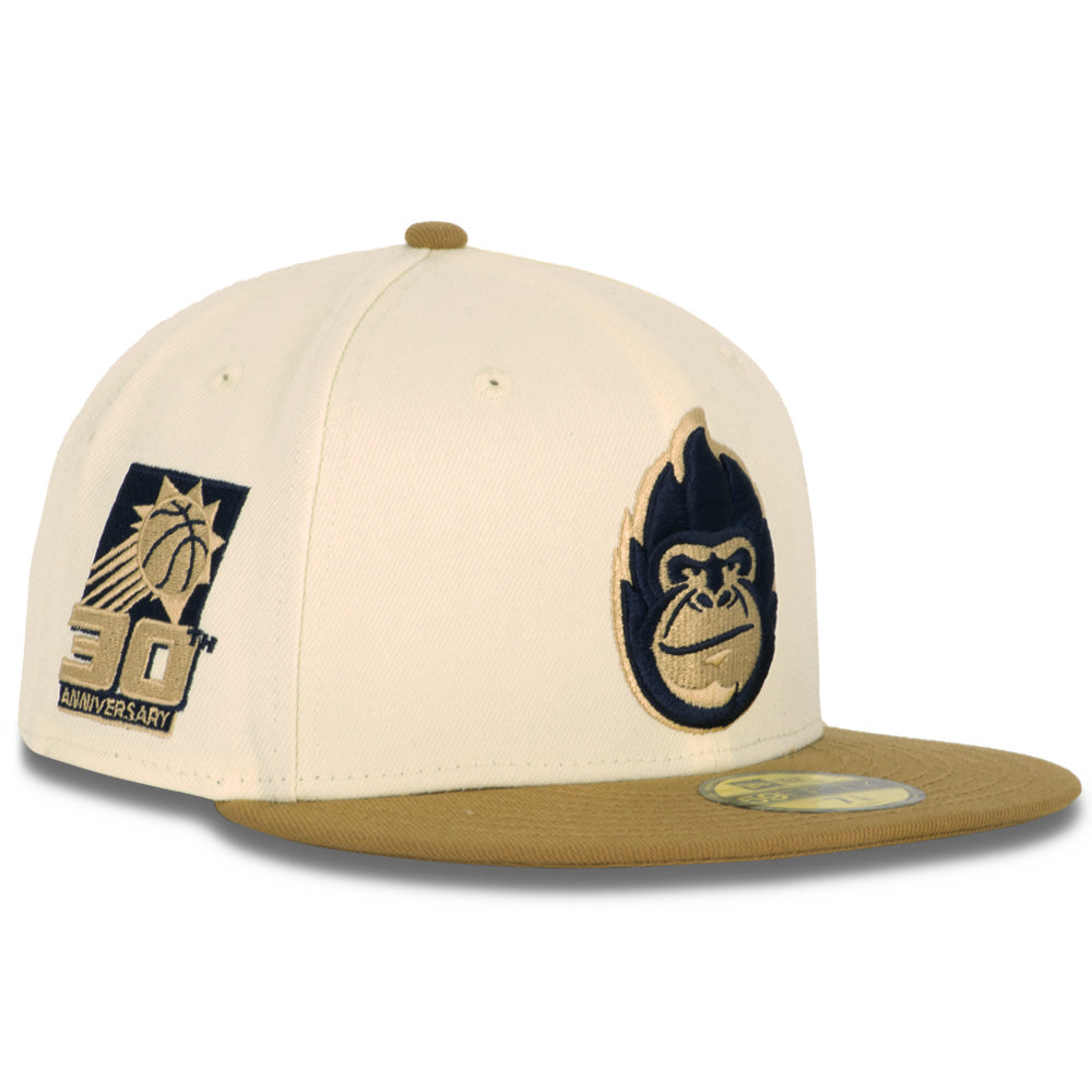 This New Era Phoenix Suns New Era Mascot Harvester 59FIFTY Fitted was released by Just Sports. The fitted has a cream six panel structured high crown and embroidered eyelets with a tan fabric squatchee button. The flat bill of the fitted cap is also tan. The front panel features the Phoenix Suns logo embroidered in tan and midnight navy blue stitching. The left panel of the fitted displays the New Era logo and celebratory side patch on the right panel.