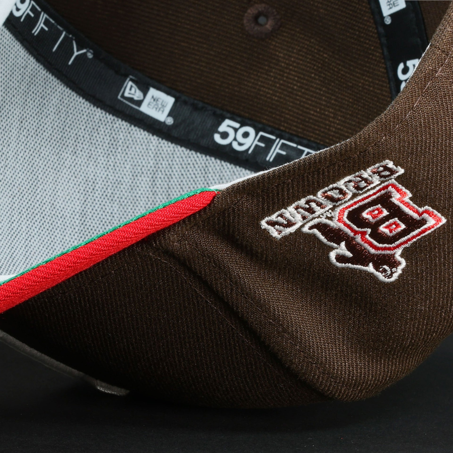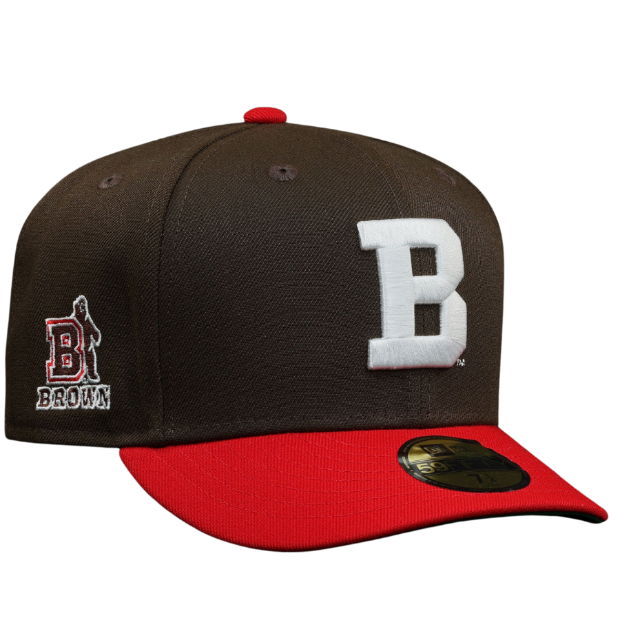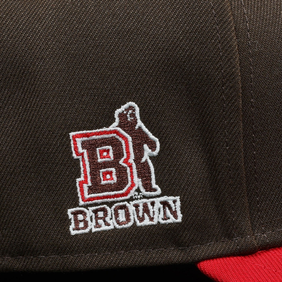 This Brown university Brown Bears 59FIFTY fitted hat was released by My Fitteds. The fitted has a mahogany brown six panel structured high crown and embroidered eyelets with a red flat brim and fabric squatchee button. The fitted also has a grey undervisor. The front panel features the Brown Bears logo embroidery with a side patch on the right panel. The left panel of the fitted displays the New Era logo and the Brown Bears embroidery on the rear crown.