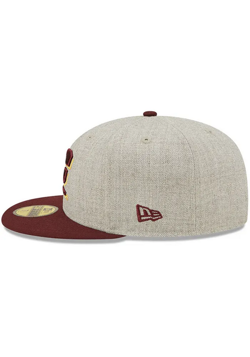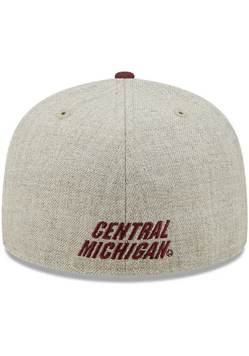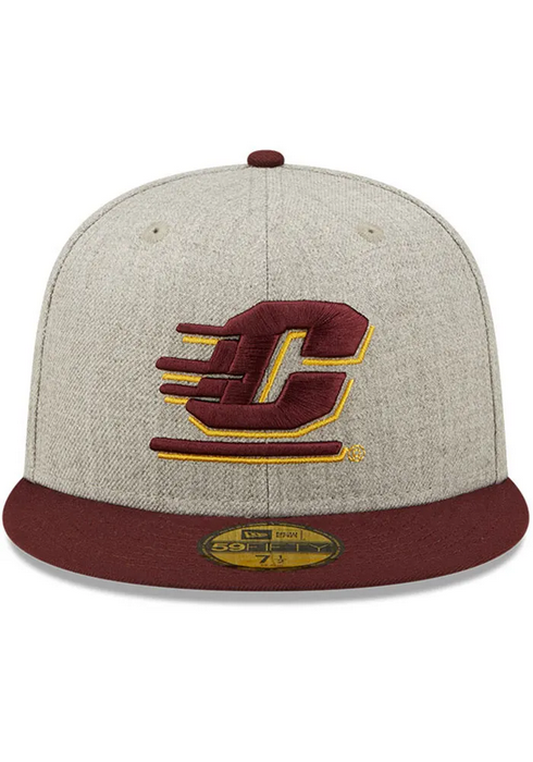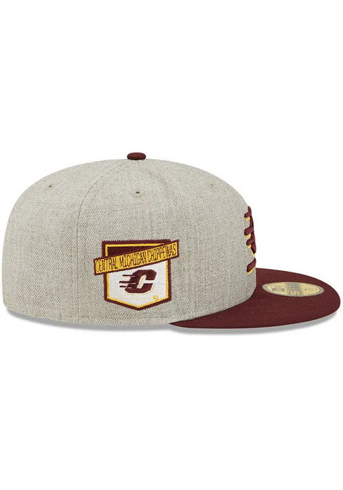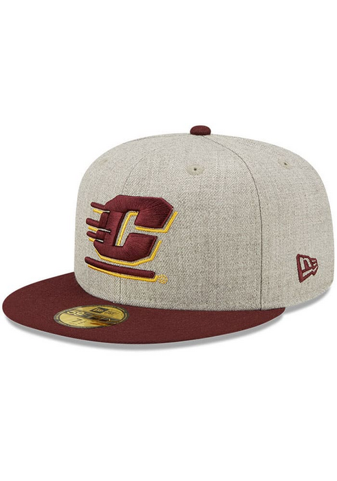 This Central Michigan Chippewas Heather Grey fitted hat has a six panel structure high crown, embroidered eyelets, fabric squatchee button, flat bill and a side patch on the right-wear side.