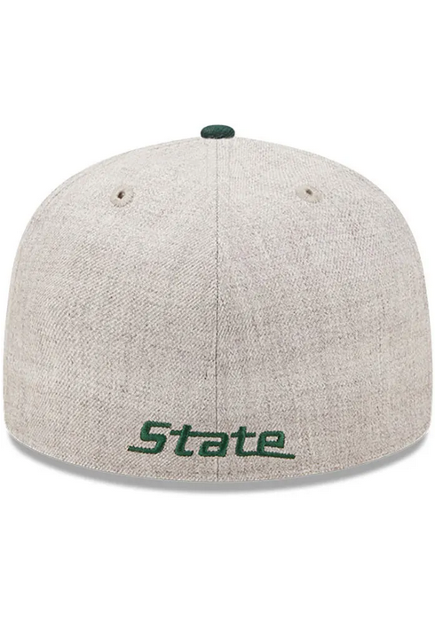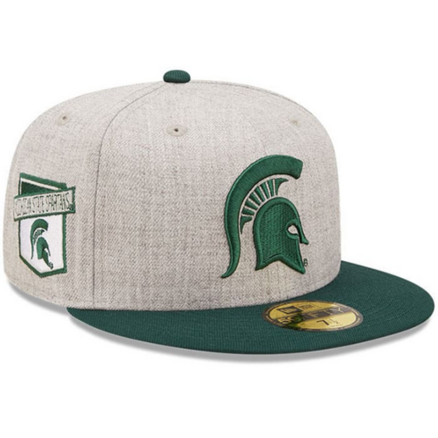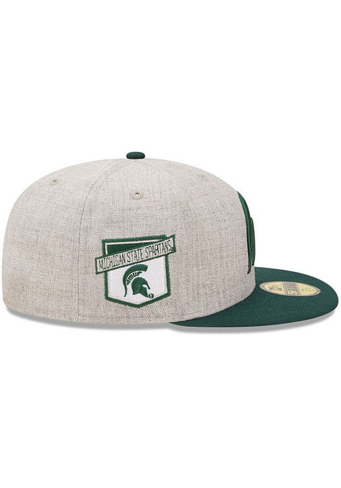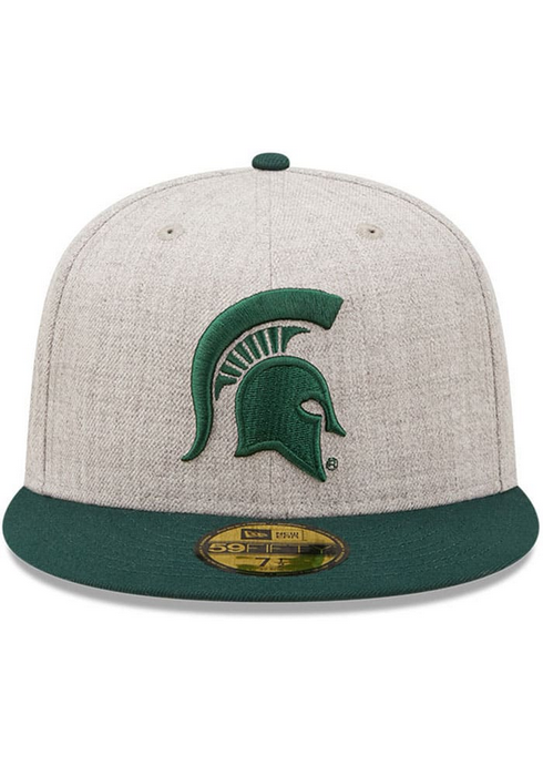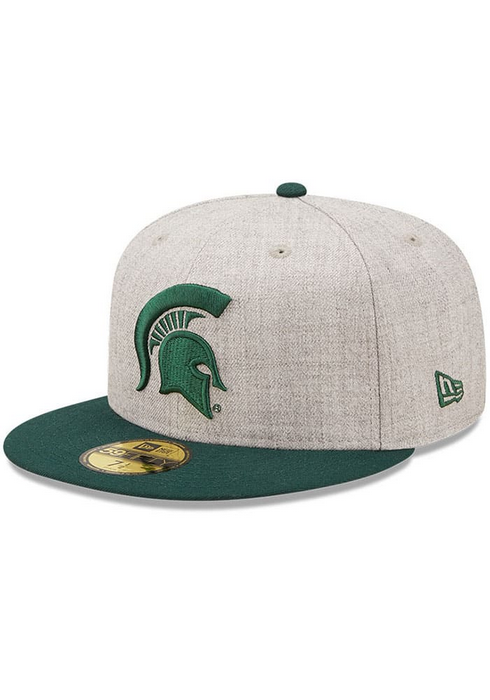 This Michigan State Spartans Heather Grey fitted hat has a six panel structure high crown, embroidered eyelets, fabric squatchee button, flat bill and a side patch on the right-wear side.