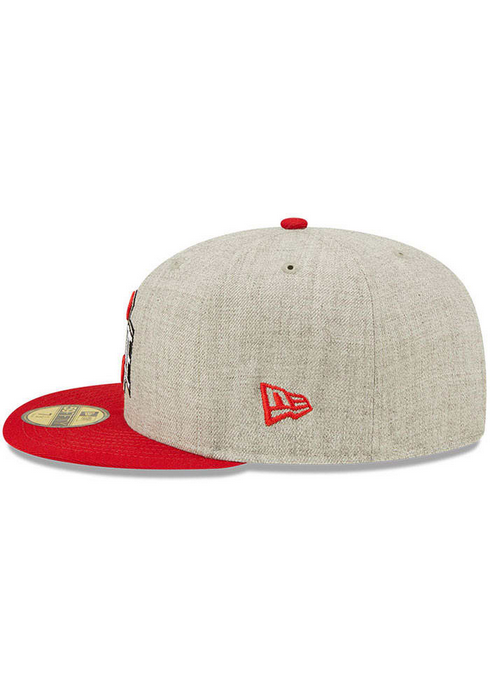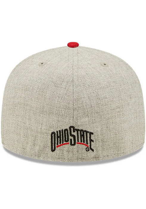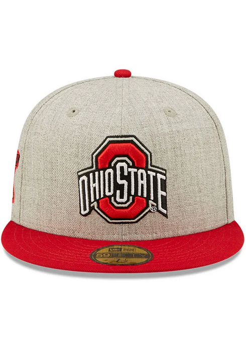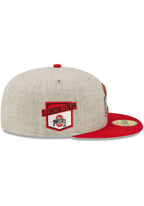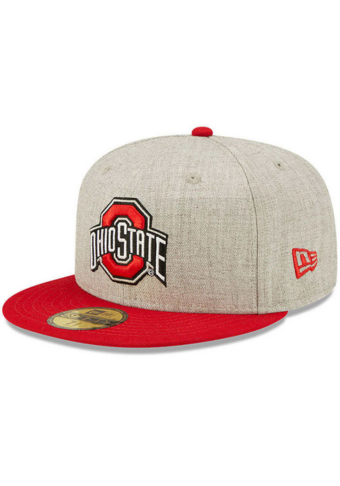 This Ohio State Buckeyes Heather Grey fitted hat has a six panel structure high crown, embroidered eyelets, fabric squatchee button, flat bill and a side patch on the right-wear side.
