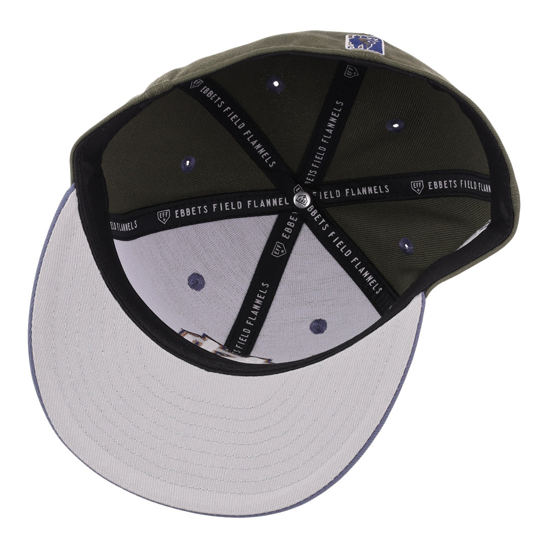 Description: Featuring a two-tone construction with olive crown and slate visor, the Mossy Slate Vintage Inspired fitted collection takes some of our favorite teams and their logos, and recontextualizes them to create fashion pieces that will shine in your wardrobe. The contemporary high crown structured fitted cap features raised embroidery front logo with embroidered side patch and rear league logo.