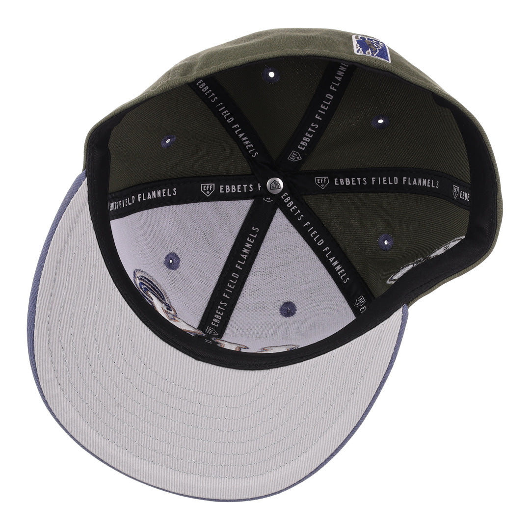 Description: Featuring a two-tone construction with olive crown and slate visor, the Mossy Slate Vintage Inspired fitted collection takes some of our favorite teams and their logos, and recontextualizes them to create fashion pieces that will shine in your wardrobe. The contemporary high crown structured fitted cap features raised embroidery front logo with embroidered side patch and rear league logo.