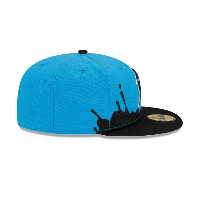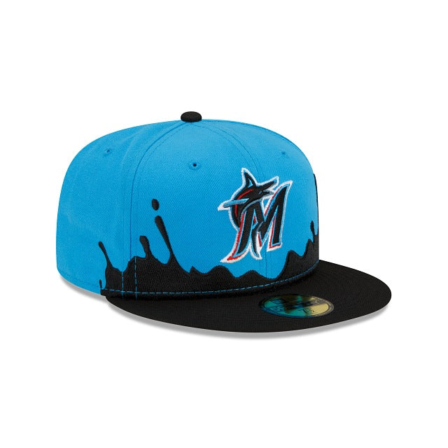 The Miami Marlins Drip Front 59FIFTY Fitted Cap features an embroidered Marlins logo at the front panels, with a splatter detailing in the teams alternate color rising from the visor, and a matching MLB Batterman logo at the rear.