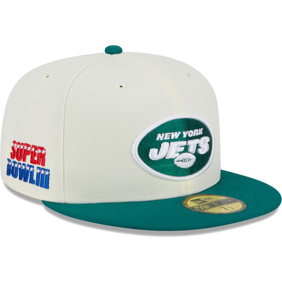 Browse a large selection of New York Jets fitted hats. Check out multiple shops selling the latest, officially NFL licensed, 59FIFTY New Era New York Jets fitted caps (high and low crowns) with various colorways, undervisors and embroidered side patches including Pro Bowl, Super Bowl, Anniversary, Conferences and more. Some of the football caps in this collection have been archived for historical record keeping purposes. The further down you scroll the more likely you will run into fitteds that are no longer being sold.
