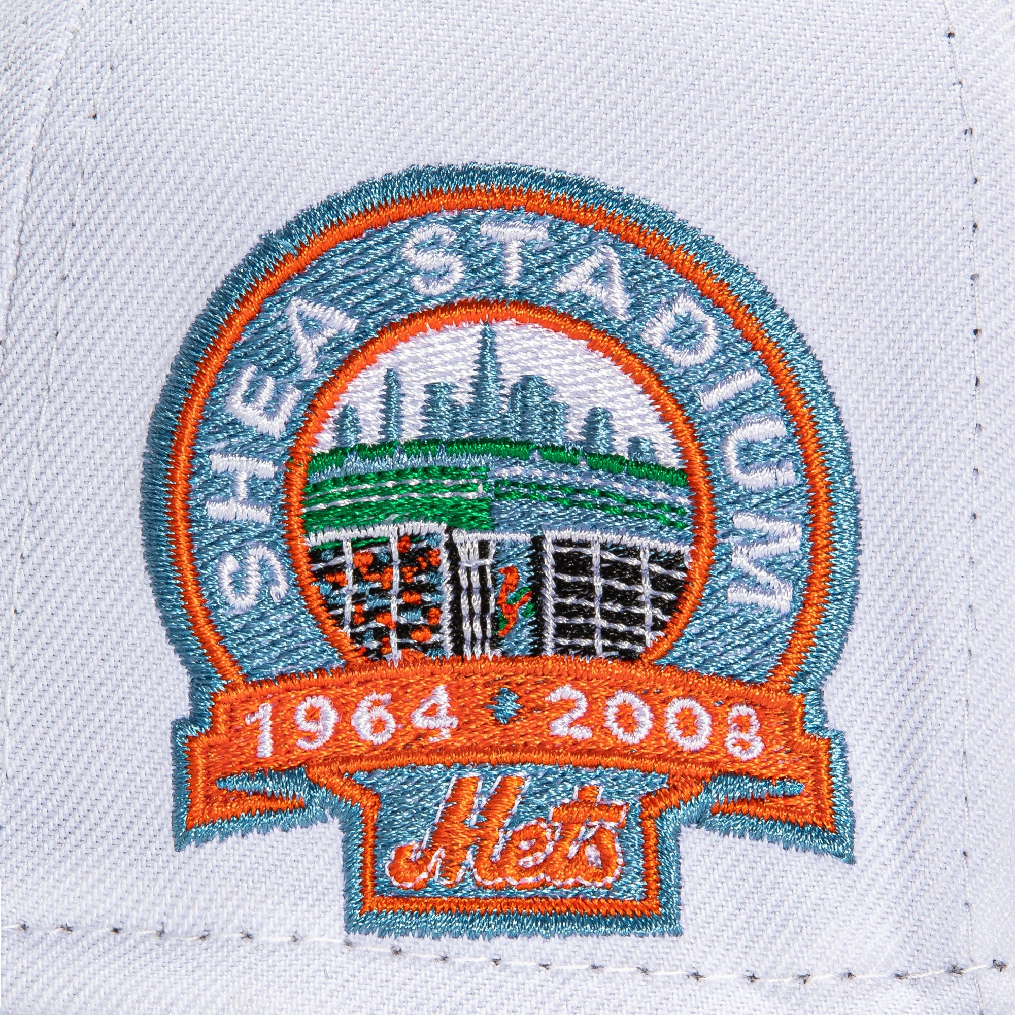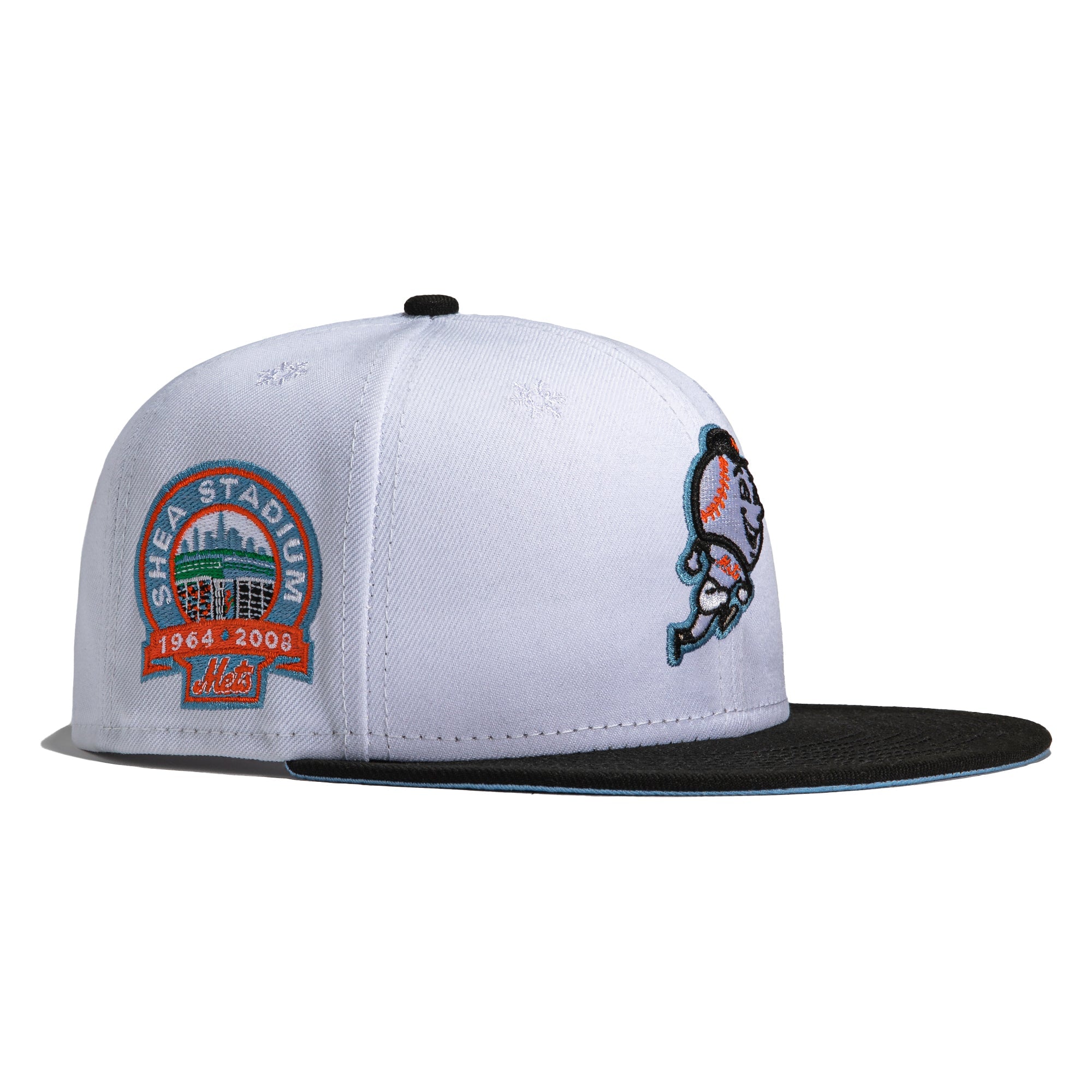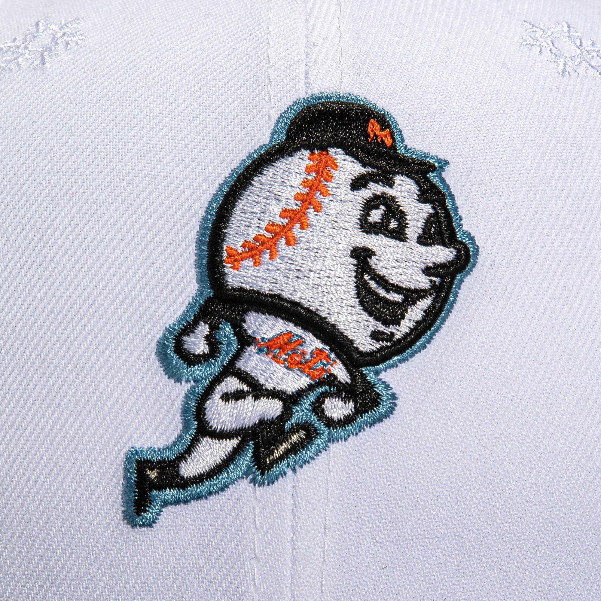 This New Era New York Mets 'Snowman' Shea Stadium 2022 59FIFTY Fitted Hat was released by Hat Club. The fitted has a white six panel structured high crown and snowflake embroidered eyelets with a black fabric squatchee button. The flat bill of the fitted cap is also black with a light blue undervisor. The front panel features the New York Mets logo embroidery and a side patch embroidered on the right panel. The left panel of the fitted displays the New Era logo and the official MLB Batterman insignia embroidered on the rear crown. The fitted hat colorway is inspired by the colors of a snowman.